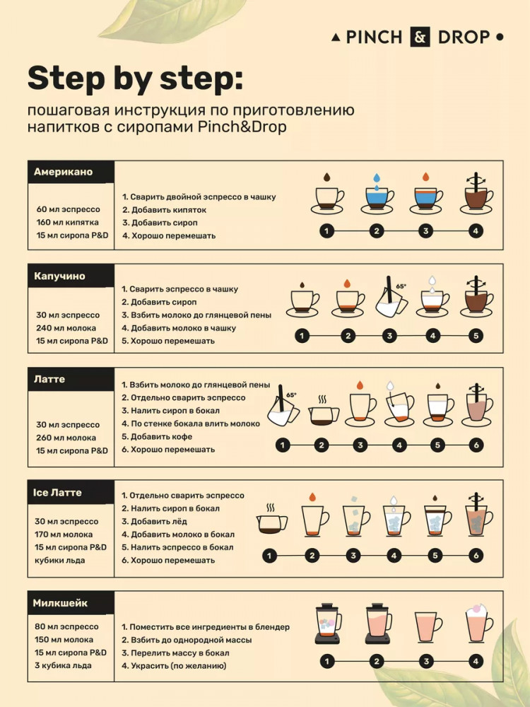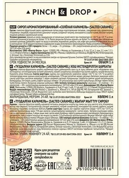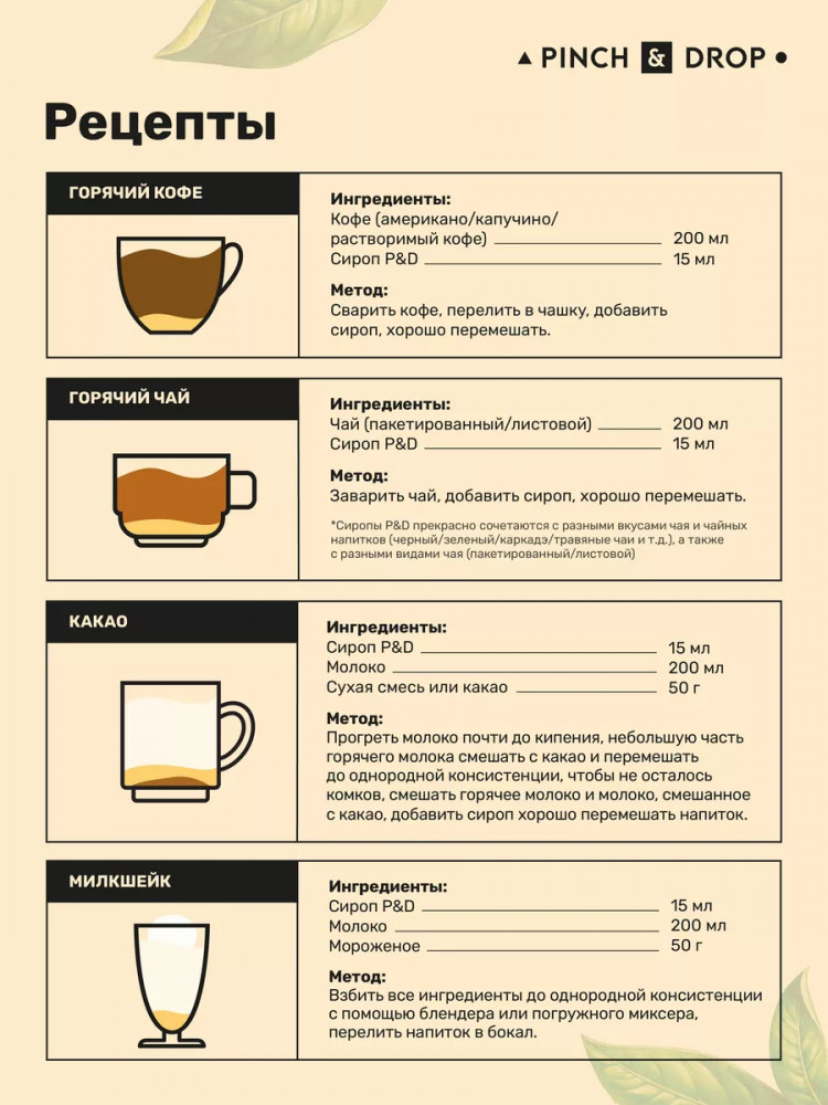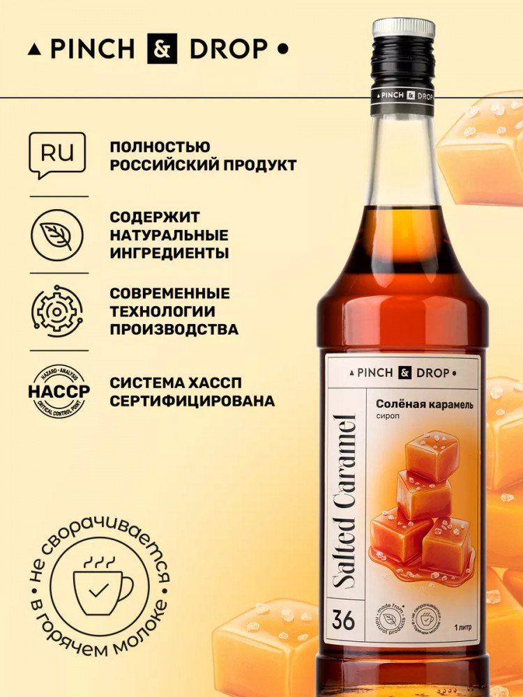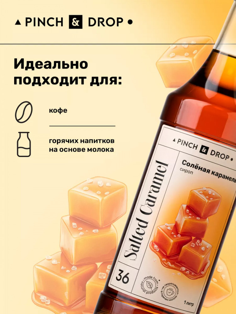 Сироп Pinch&Drop —универсальная добавка для десертов и напитков. Этот сироп может стать частью профессионального или домашнего набора ингредиентов для приготовления кулинарных шедевров. Пригодится для организации мероприятий: для украшения блюд на фуршетах и банкетах. Можно использовать в качестве топпинга к мороженому, йогурту или блинам, а также добавлять в кофе, чай, газированную воду, в коктейли для придания им карамельной сладости. Еще одно возможное применение: в качестве натурального подсластителя в выпечке и десертах.