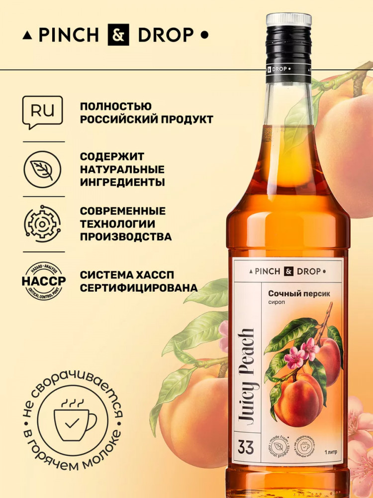 Сироп «Персик» — это сладкая добавка к рецептам, которые вы хотите немного преобразить. Вкус персика, сочный и нежный, идеально передан в сиропе «Персик». Продукт имеет малозаметную кислинку, которая придает ему свежесть. Это сладкие ноты, которые имеют аромат фруктов. Того самого персика, только с дополнительной сахарной сладостью.