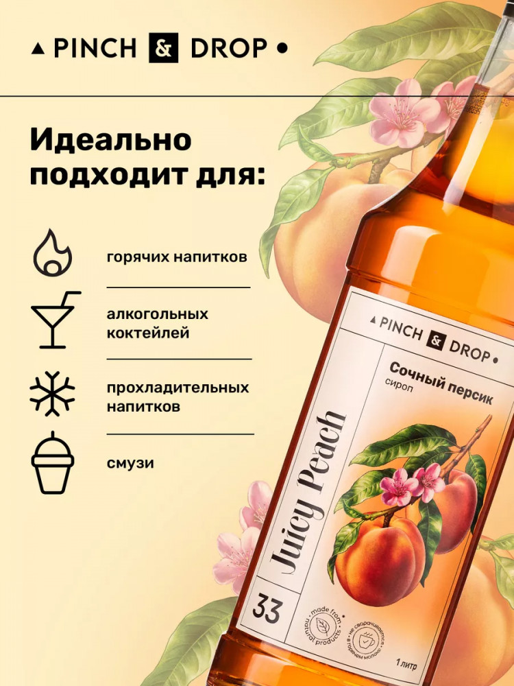 Персик в коктейлях раскрывается фруктовых вкусом. Алкогольные коктейли с ним становятся свежими и яркими, они приобретают сочность и неповторимый летний аромат. Вкусно добавить немного сиропа в безалкогольные напитки. Натуральный сироп неплохо сочетается с кофе, иногда его добавляют в чай, чтобы придать сладость и дополнить напиток фруктовым вкусом. Десерты и мороженое с персиком прекрасны, как и выпечка. Часто используют для пропитки и для украшения блюд, так как сироп густой и красиво ложится линиями на тарелках, придавая блюдам дополнительный шарм.