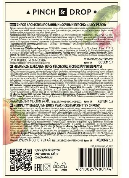 Сироп Pinch&Drop —универсальная добавка для десертов и напитков. Этот сироп может стать частью профессионального или домашнего набора ингредиентов для приготовления кулинарных шедевров. Пригодится для организации мероприятий: для украшения блюд на фуршетах и банкетах. Можно использовать в качестве топпинга к мороженому, йогурту или блинам, а также добавлять в кофе, чай, газированную воду, в коктейли для придания им карамельной сладости. Еще одно возможное применение: в качестве натурального подсластителя в выпечке и десертах.