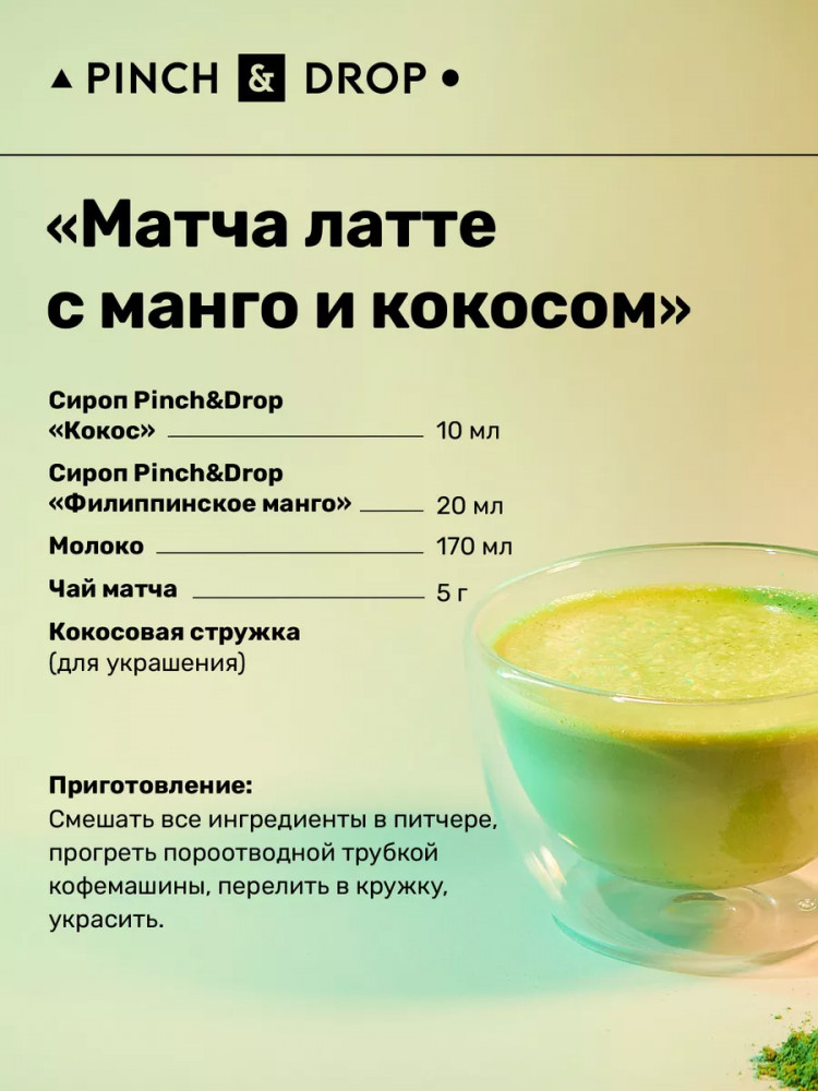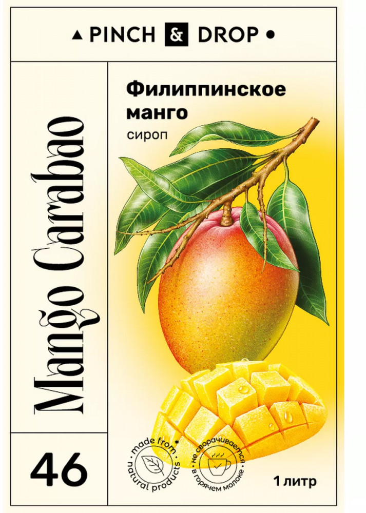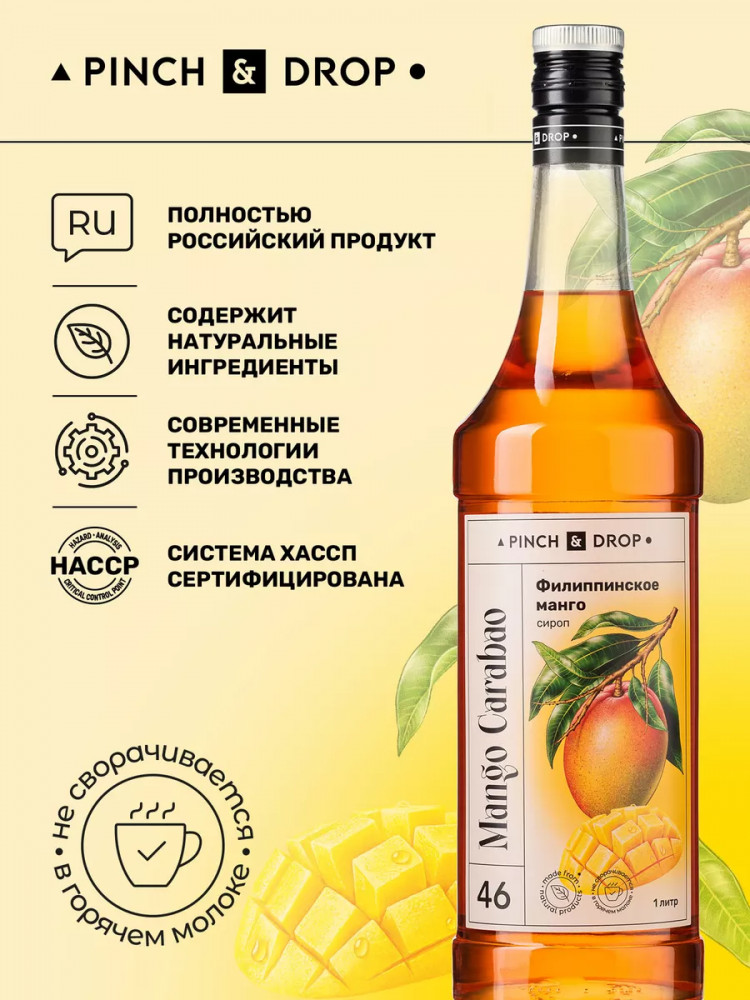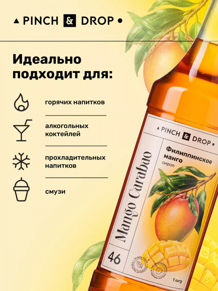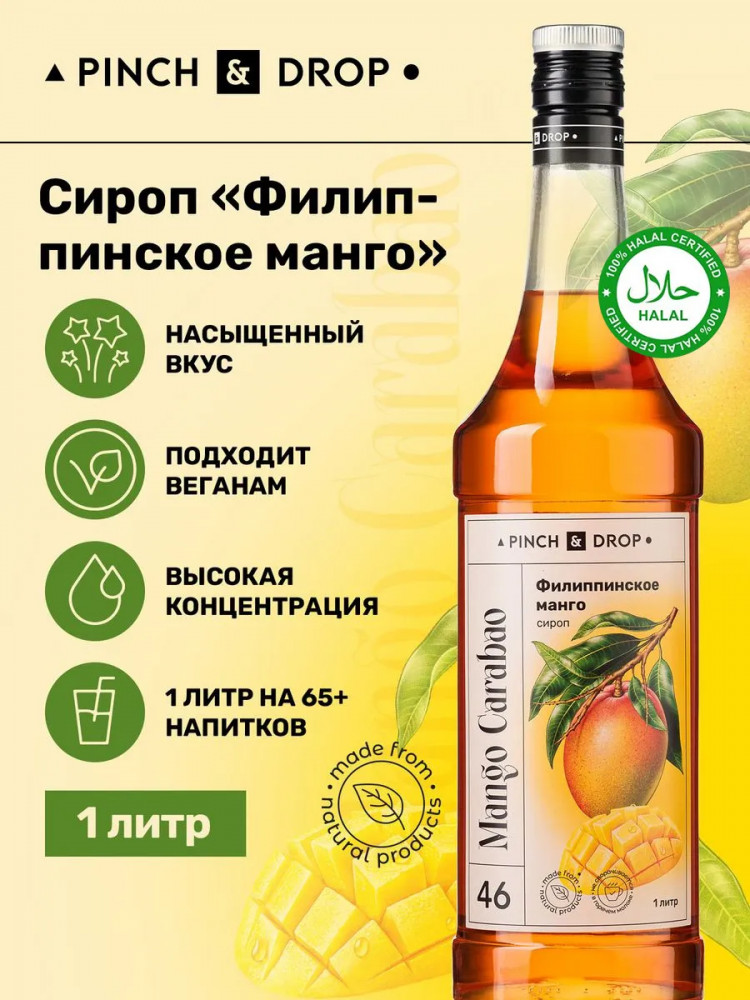 Сироп «Филиппинское Манго» Pinch&Drop отличается ярким вкусом сочного плода. Он сладкий и хорошо выраженный, имеет приятную кислинку, которая почти незаметна, но дополняет вкус свежестью. «Филлипиннское манго» — сироп для кофе. В его нотах сладость сочного плода, кислота шкурки. Неповторимый вкус манго перепутать сложно, но именно этот сироп среди подобных вариантов становится лидером. Потому что именно он полностью раскрывает оттенки яркого плода и словно переносит нас в тепло.