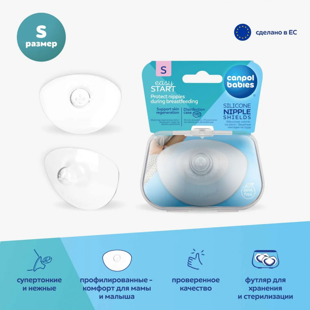Накладки на соски из мягкого и нежного силикона обеспечивают безболезненное кормление. Они прекрасно защищают воспаленные и потрескавшиеся соски и ускоряют заживление ран. Верхний, чуть более узкий край накладки позволяет малышу обнять грудь матери, почувствовать запах ее кожи и тепло. Силикон не имеет запаха и вкуса, поэтому не влияет на вкус молока. Специальный чехол для стерилизации помогает содержать накладки в чистоте. Они обеспечивает быструю двухминутную дезинфекцию в микроволновой печи. В упаковке 2 шт. |