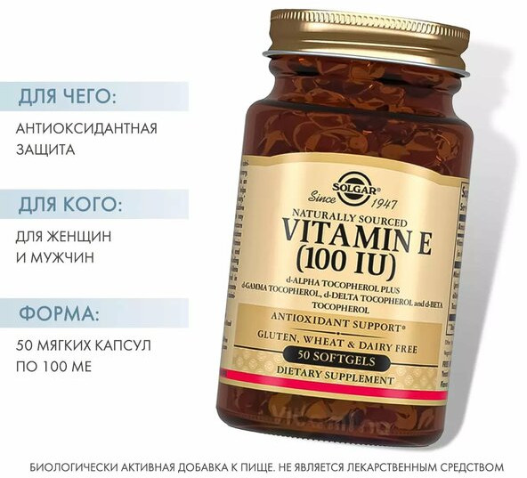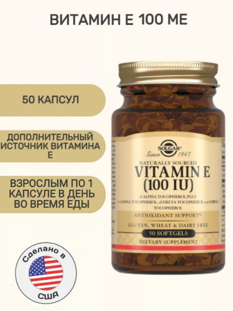В данный момент этот товар отсутствует в продаже. Возможно, у нас найдется аналогичный или похожий товар здесь. Капсулы Витамин Е 100 МЕ рекомендуются в качестве дополнительного источника витамина Е. Витамин Е 100 МЕ содержит натуральный витамин Е представленный в виде d-альфа токоферола а так же смесь изомеров токоферола d-бета d-дельта d- гамма которые усиливают антиоксидантные свойства витамина Е. Витамин Е обладает антиоксидантным действием способствует защите сердечно-сосудистой системы позволяет снизить риск преждевременного старения кожи.