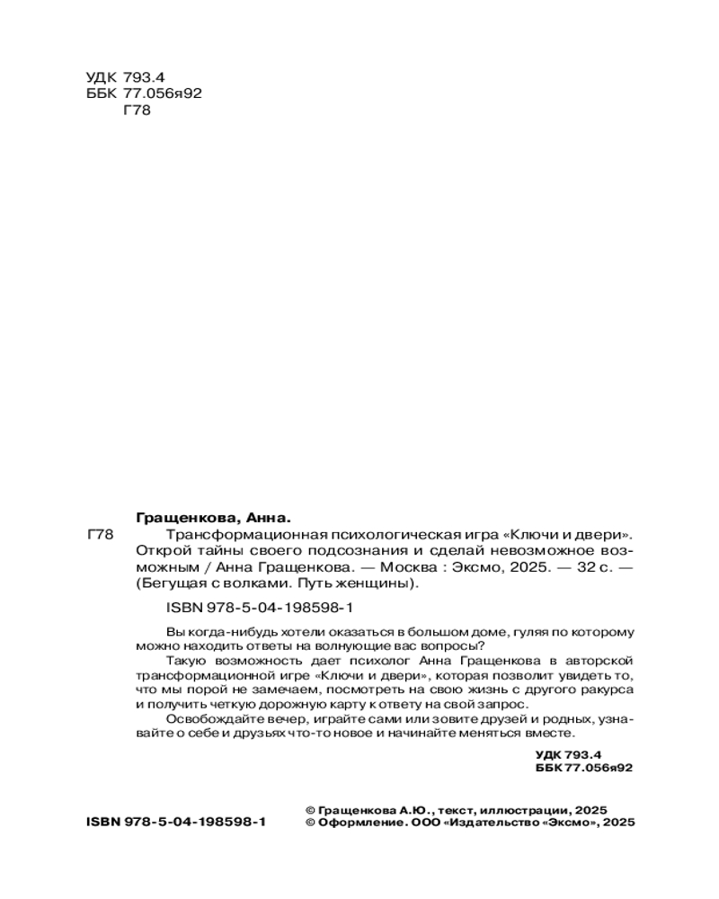 💳 Оплатить за товар можно при получении 🇰🇿 Есть бесплатная доставка по Казахстану от 1 дня 🎁 Копите бонусы с каждой покупки Серия: Бегущая с волками. Путь женщины Эта трансформационная игра подарит вам не только озарения, но и возможность найти ответы на самые волнующие вопросы, позволит взглянуть на свою жизнь с совершенно иного ракурса и получить новый опыт психоанализа, приобретенный в процессе увлекательной прогулки по сказочному дому. |