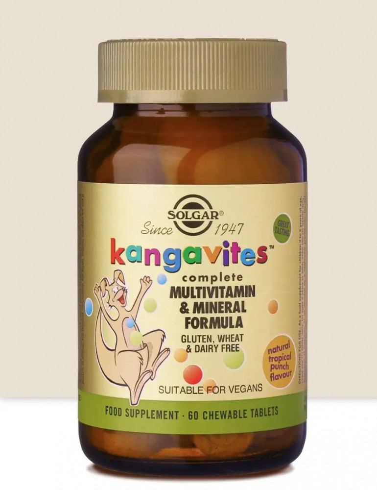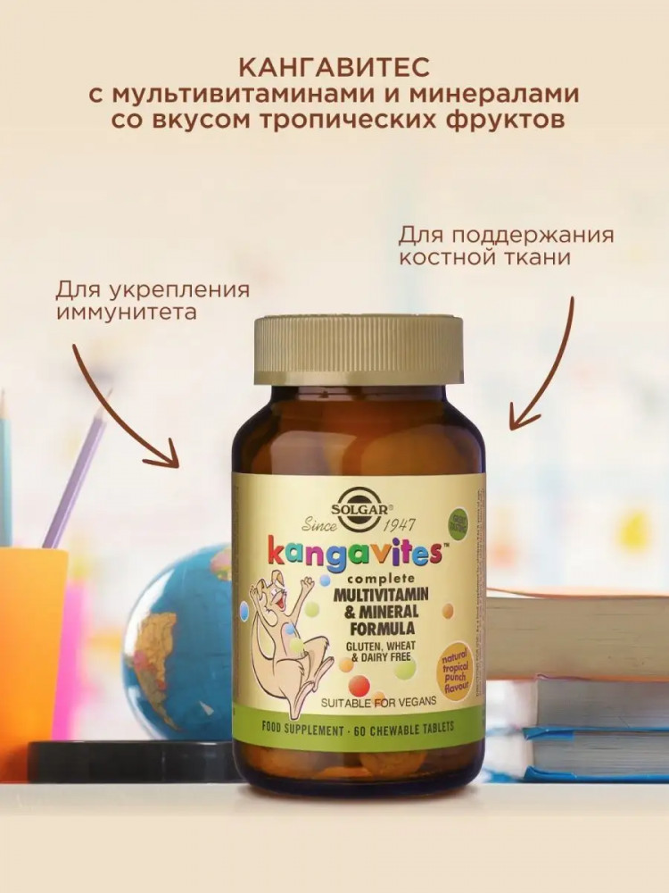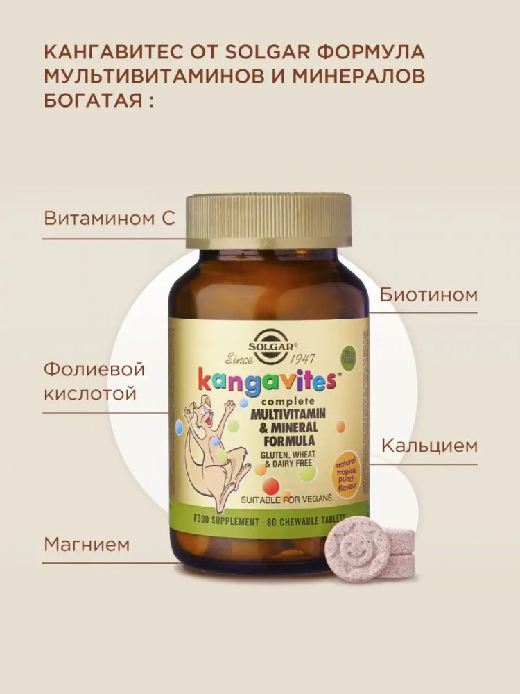 Solgar Таблетки жевательные со вкусом тропических фруктов «Complete Multivitamin & Mineral Formula. комплекс витаминов и минералов»В данный момент этот товар отсутствует в продаже. Возможно, у нас найдется аналогичный или похожий товар здесь. Серия: Kangavites Комплексная формула мультивитаминов и минералов со вкусом тропических фруктов — мультивитамины для детей в жевательных таблетках, богатые витамином С, фолиевой кислотой, биотином, кальцием, магнием. Также комплекс мультивитаминов и минералов Кангавитес от Солгар содержит селен, хром и соевый лецитин. Стимулируя функции роста и развития, данный продукт снабжает организм веществами, необходимыми для развития и поддержки тканей и систем организма, содействует нормальному функционированию нервной и мышечной системы, а также улучшению памяти и мозговых функций. «Кангавитес™. Комплексная формула мультивитаминов и минералов со вкусом тропических фруктов» выпускается в форме жевательных таблеток, подслащенных фруктозой и ароматизированных натуральными экстрактами тропических фруктов и овощей. Также данный комплекс содержащит биофлавоноиды цитрусовых, экстракты брокколи, красной свеклы, моркови, абрикосов, яблок, клубники и шиповника и удовлетворяет суточную потребность развивающегося организма в витаминах и минералах. |