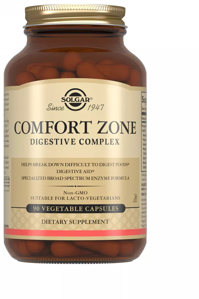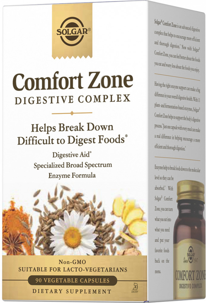 В данный момент этот товар отсутствует в продаже. Возможно, у нас найдется аналогичный или похожий товар здесь. Комфорт зон — передовой комплекс, разработанный специалистами компании Solgar, помогает нормализовать работу пищеварительной системы, обеспечивая хорошее самочувствие. В состав комплекса входит 11 природных ферментов, которые помогают поддержать естественный процесс пищеварения, предотвращая возникновение таких неприятных симптомов как: брожение, проявление метеоризма, вздутие живота, спазмы кишечника, ощущение тяжести и т.д. Порой мы даже не догадываемся, что включив тот или иной фермент в свой ежедневный рацион мы можем извлечь дополнительную выгоду из привычных нам продуктов. Ферменты способствуют расщеплению белков на аминокислоты, углеводов на простые сахара и жиров на жирные кислоты. Поэтому принимая всего по 1 капсуле комплекса Comfort Zone перед каждым приемом пищи, вы можете существенно улучшить процесс переваривания пищи и усвоения полезных веществ.