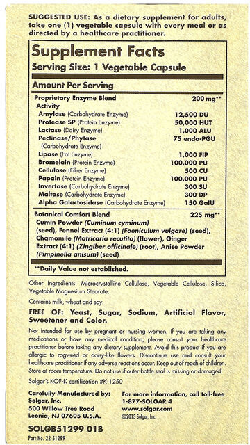 Амилаза, пектиназа / фитаза, инвертаза, мальтаза, альфа-галактозидаза, целлюлаза способствуют предотвращению процессов брожения углеводов и проявления метеоризма, лактаза позволяет уменьшить симптомы непереносимости употребления молочных продуктов, таких как жидкий стул, вздутие, болезненные спазмы в области кишечника. Протеазы, бромелайн (экстракт ананаса) и папаин предотвращают адгезию вредных бактерий к слизистой оболочке кишечника, а Липаза позволяет устранить ощущение тяжести и переполнения желудка. В комплекс добавлены также растительные экстракты: тмина, фенхеля и ромашки.