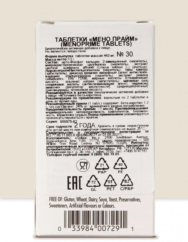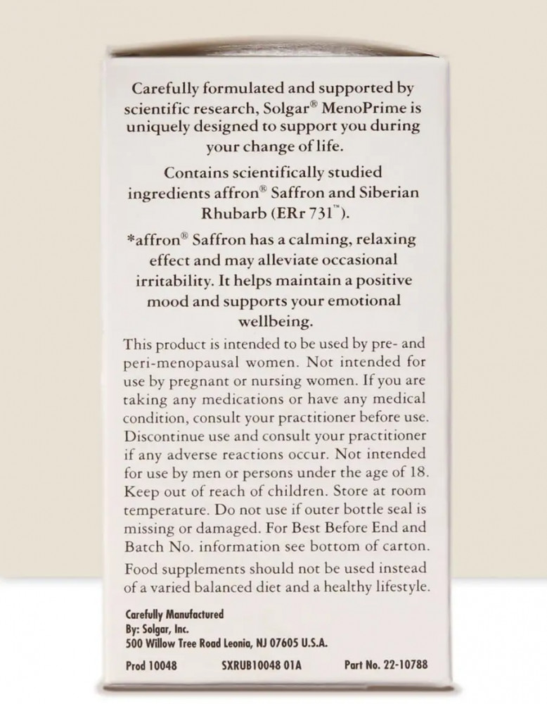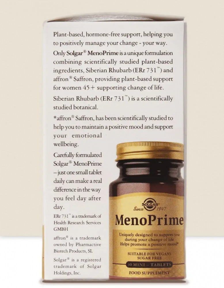 Solgar Таблетки «MenoPrime. Мено прайм»В данный момент этот товар отсутствует в продаже. Возможно, у нас найдется аналогичный или похожий товар здесь. С возрастом тело женщины существенно меняется, поэтому для сохранения здоровья и качества жизни важно уделять особое внимание этим изменениям. Мено Прайм представляет собой комбинацию высококачественных растительных экстрактов шафрана и сибирского ревеня, разработан для поддержки организма в период гормональных изменений. Экстракт шафрана способствует поддержанию эмоционального благополучия и улучшению качества сна, в то время как экстракт ревеня сибирского способствует облегчению состояния женского организма в период менопаузы и поддержке когнитивных функций. |