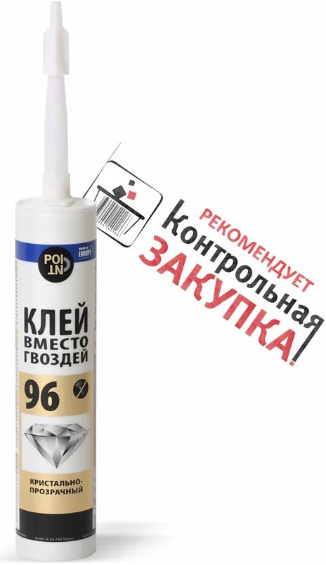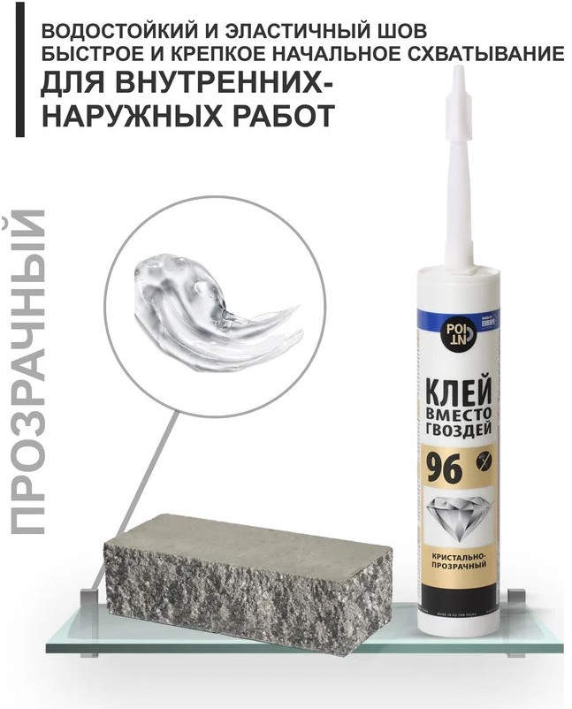 Клей вместо гвоздей 96 Point (кристально прозрачный; 280 мл) 11601868 используют во время монтажных и отделочных работ для приклеивания реек, панелей и досок из жесткого ПВХ и древесины, кессонов, розеток и карнизов из полиуретана.