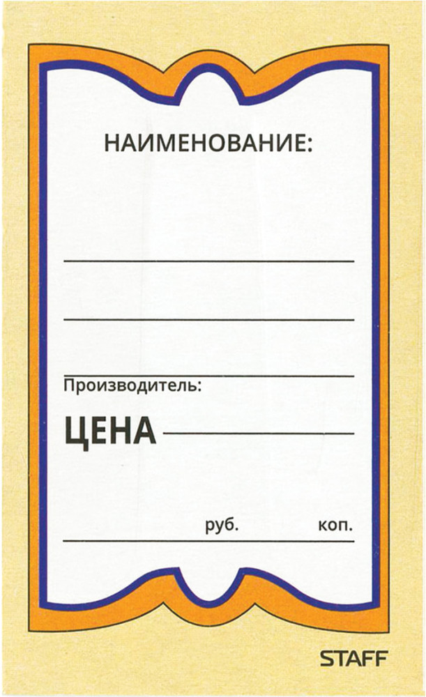 💳 Оплатить за товар можно при получении 🇰🇿 Есть бесплатная доставка по Казахстану от 1 дня 🎁 Копите бонусы с каждой покупки Картонные ценники Staff наиболее оптимальны для магазинов, торгующих продуктами питания, поскольку картон сохраняет форму при изменении влажности и температуры. Удобные поля позволяют нанести информацию о фирме, наименовании и цене. |