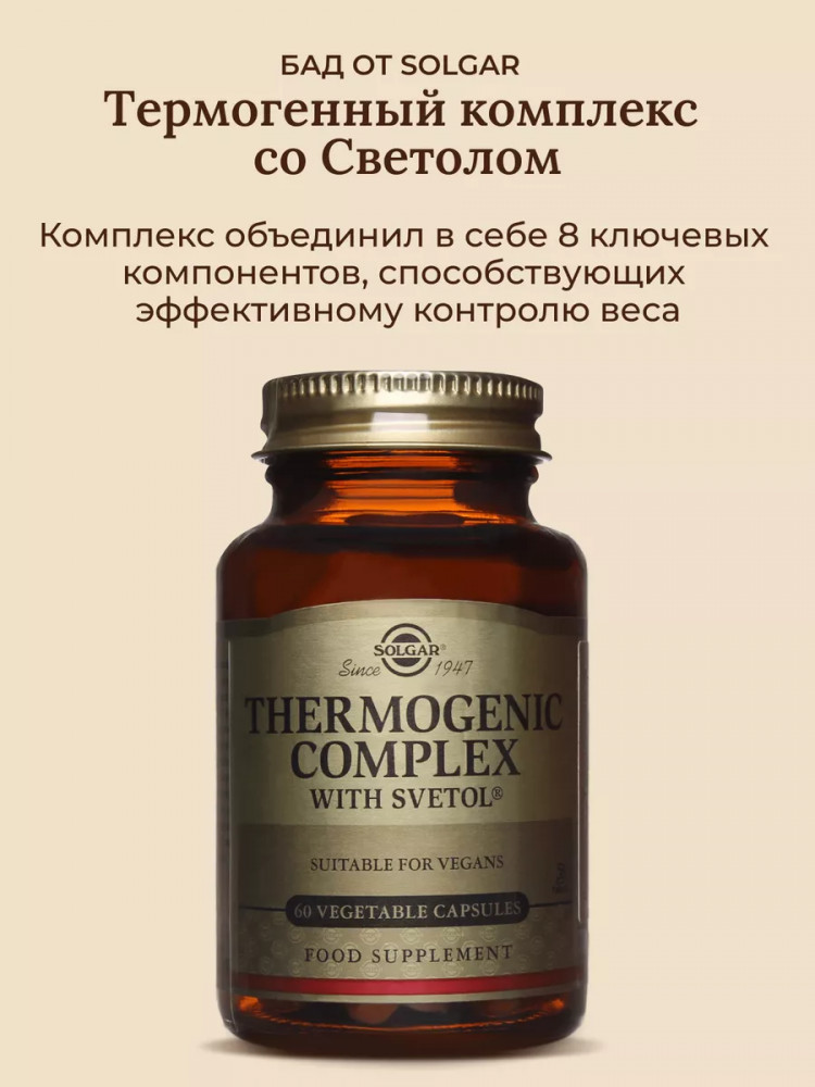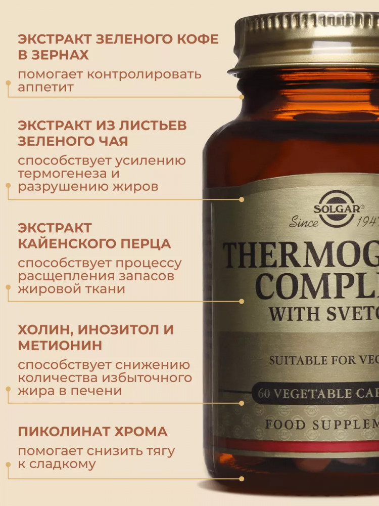 Solgar Капсулы «Thermogenic complex with Svetol. Термогенный комплекс со Светолом»В данный момент этот товар отсутствует в продаже. Возможно, у нас найдется аналогичный или похожий товар здесь. Капсулы «Термогенный комплекс со Светолом» рекомендуется в качестве дополнительного источника хрома, источника катехинов, хлорогеновой кислоты и полифенольных соединений. Данный продукт объединил в себе активные компоненты натурального происхождения, в том числе экстракт зерен зеленого кофе Svetol, экстракт листьев зеленого чая, кайенский перец, экстракт плодов черного перца (Биоперин), которые воздействуют на разные процессы контроля веса, что позволяет комплексно подойти к поддержанию стройной фигуры |