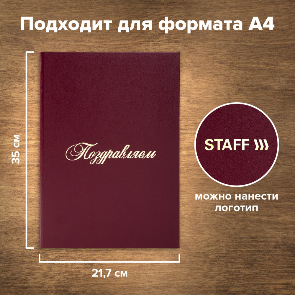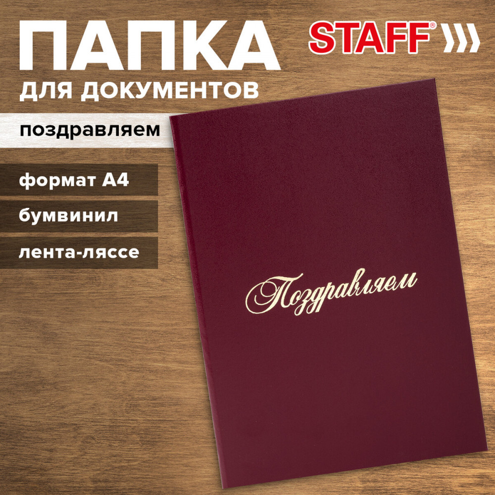 Адресная папка Staff используется для поздравления, вручения наград и дипломов и т.д. Изготовлена из прочного картона, покрытого бумвинилом. Папка для поздравлений формата А4 выполнена в насыщенном бордовом цвете. На обложке — орнамент и надпись «Поздравляем!», нанесенные с помощью золотого тиснения. Снабжена лентой для удержания документов (ляссе). Предусмотрено нанесение логотипа. Каждая солидная компания или организация должна иметь адресную папку. Спешите приобрести все необходимое для успешной трудовой деятельности! |