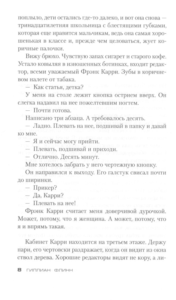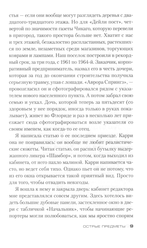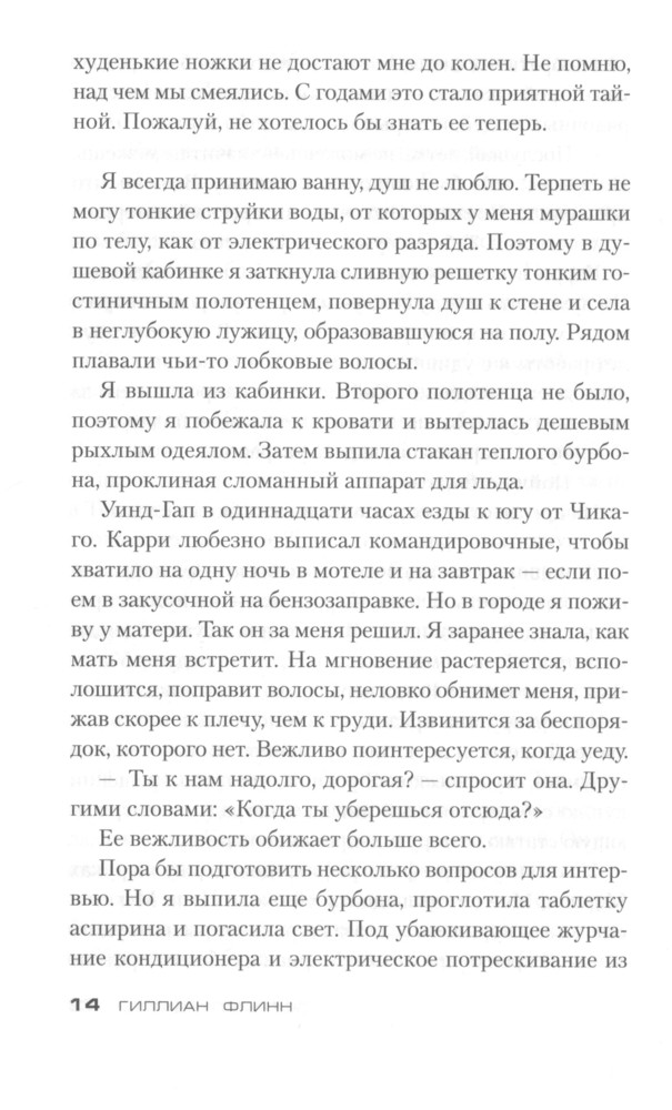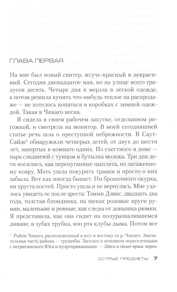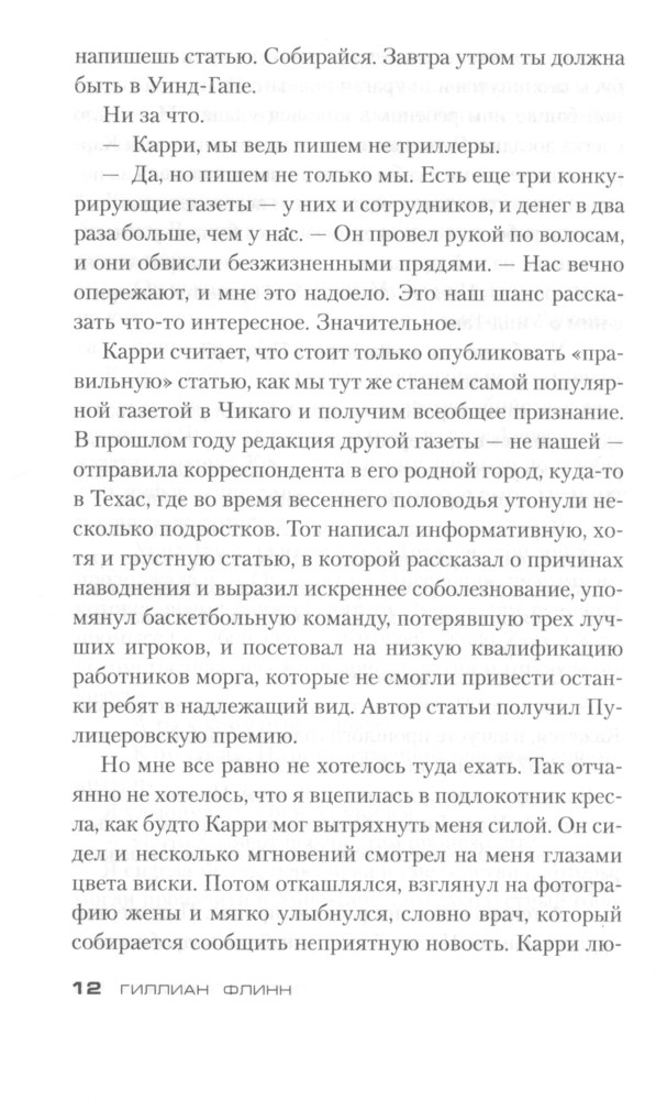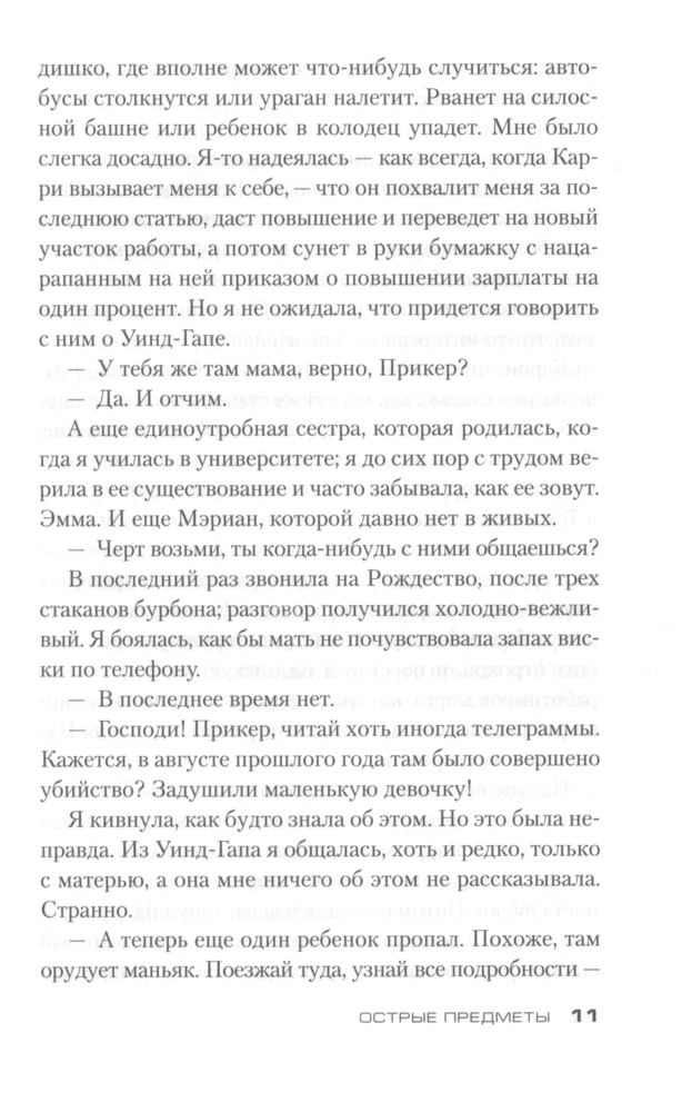 Гиллиан Флинн - это что-то! На "Лайвлибе" и "Фантлабе" многие почему-то ругают её. Обычно я солидарен с ними, НО не насчет Гиллиан Флинн! Лично меня, этот автор покорил! Её ругают за жестокость и излишний натурализм (видимо, Клайва Баркера, Германа Миллера, Сорокина и иже с ними никто не читал), но, как по мне, все это органично вписывается в тот мир и уклад, который живет на страницах романа. Все персонажи порочны и грешны, не идеальны, с кучей проблем и комплексов, страстишек и странностей, характеры по-настоящему живые!Все ругают её за предсказуемость... Но я не ожидал такой концовки вообще! Все ругают её за то, что живописует мерзости и гадости. Но такова жизнь! Оглянись, и ты легко увидишь все эти мерзости, просто в другой обертке и проявлениях, может быть. Самое главное, Гиллиан Флинн действительно пишет ЛИТЕРАТУРУ. Качественное произведение даже в переводе. Интересные образы, метафоры, меткие и неожиданные сравнения, точная передача запахов: даже Набоков на миг вспомнился. Давно хотел познакомиться с Гиллиан Флинн. Когда посмотрел фильм своего любимого режиссера Дэвида Финчера "Исчезнувшая", пришел в восторг от сюжета и самой истории. Тогда уже понял, что такую историю мог написать только выдающийся автор. Позже узнал, что первоисточник - роман - написан Флинн. Купил сразу все три романа, просто проглотил "Острые предметы" и восхищен - динамично, харизматично и захватывающе. Уже начал "Темные тайны"... Флинн пишет книги по три года, и видно, что много труда вкладывает в это. Качество на лицо. Не зря Стивен Кинг и Кейт Аткинсон в восторге от неё, я с ними согласен, все те кучи наград, которые получил автор на родине в США и в Великобритании - абсолютно заслужены!