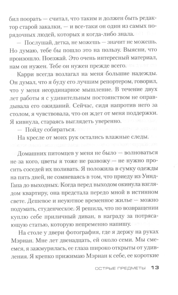 Острые предметыВ данный момент этот товар отсутствует в продаже. Возможно, у нас найдется аналогичный или похожий товар здесь. Серия: Звезды мирового детектива Камилла Паркер, не особо удачливый репортер одной из не особо успешных газет Чикаго, мечтает о блестящей карьере. И вот девушке выпадает счастливый шанс, способный резко повысить ее журналистский статус, — Камиллу посылают корреспондентом в маленький городок, где жертвой маньяка стали несколько малолетних девочек. Ее задача выдать читателям сенсационное сообщение с места событий. Дело в том, что Камилла в этом городе родилась и выросла, а потому кому, как не ей, легче других найти общий язык с жителями и выяснить нюансы расследования. Но погружение в страшную реальность провинциальной жизни оборачивается для нее цепью кошмаров, достойных кисти Иеронима Босха… |