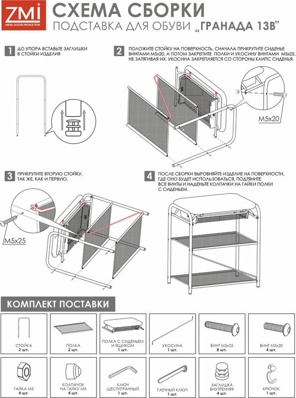 Обувница Гранада 13В поставляется в разобранном виде в прочной картонной упаковке с фурнитурой и деталями для сборки. При правильной эксплуатации срок службы составляет 10 лет.
