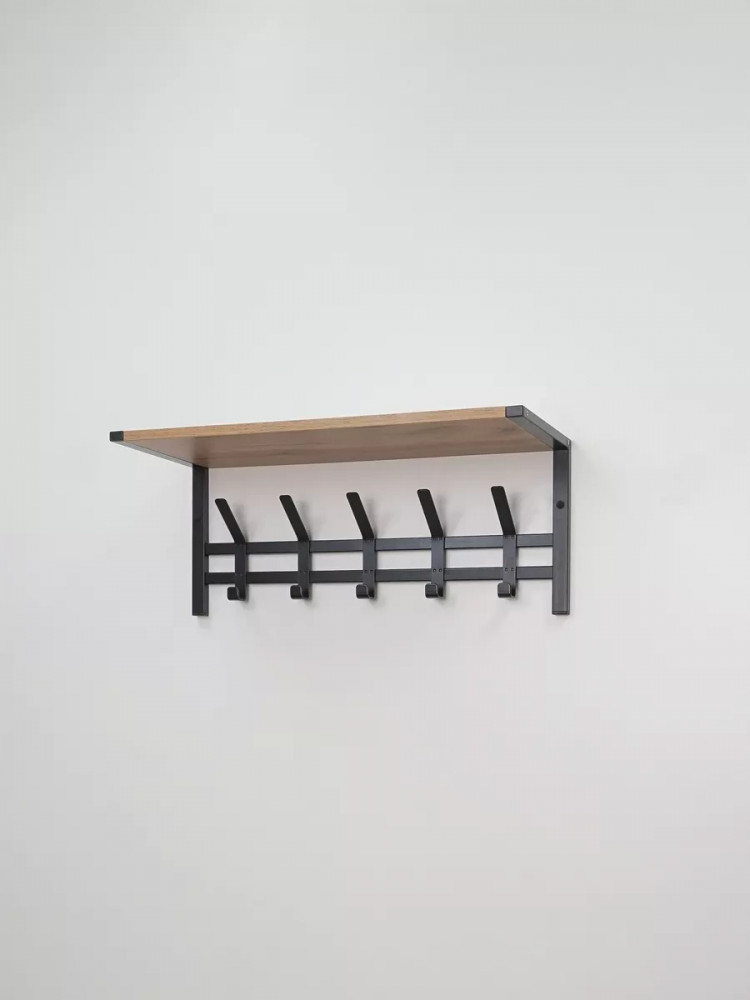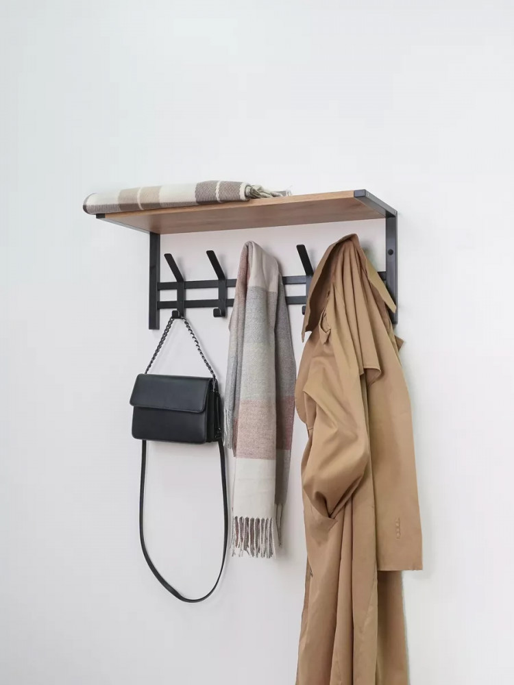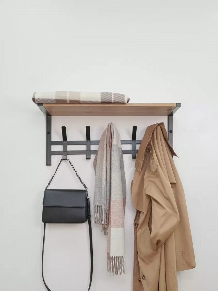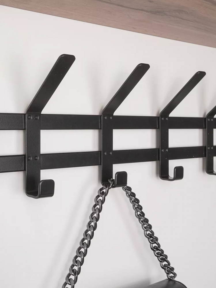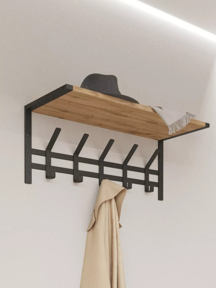 Настенная вешалка с полкой в стиле лофт Торонто 21Д — это идеальное решение для создания функционального пространства в вашей прихожей или гардеробной. Эта модель прекрасно впишется в любой интерьер в стиле лофт, добавляя нотку современности и оригинальности. Она обладает всеми необходимыми качествами для удобного хранения одежды и аксессуаров. На деревянной полке можно разместить головные уборы, шарфы или свои любимые предметы. Это удобное дополнение, которое поможет вам организовать пространство и добавить характер вашему интерьеру. 5 двойных стильных крючков позволят вам подвесить одежду, шапки или сумки, удобно расположив их для быстрого доступа.