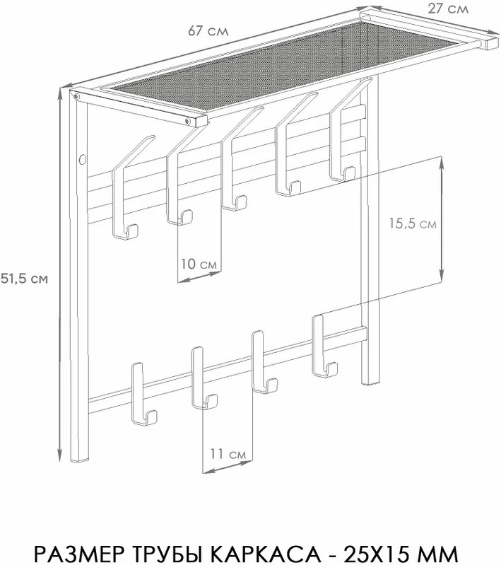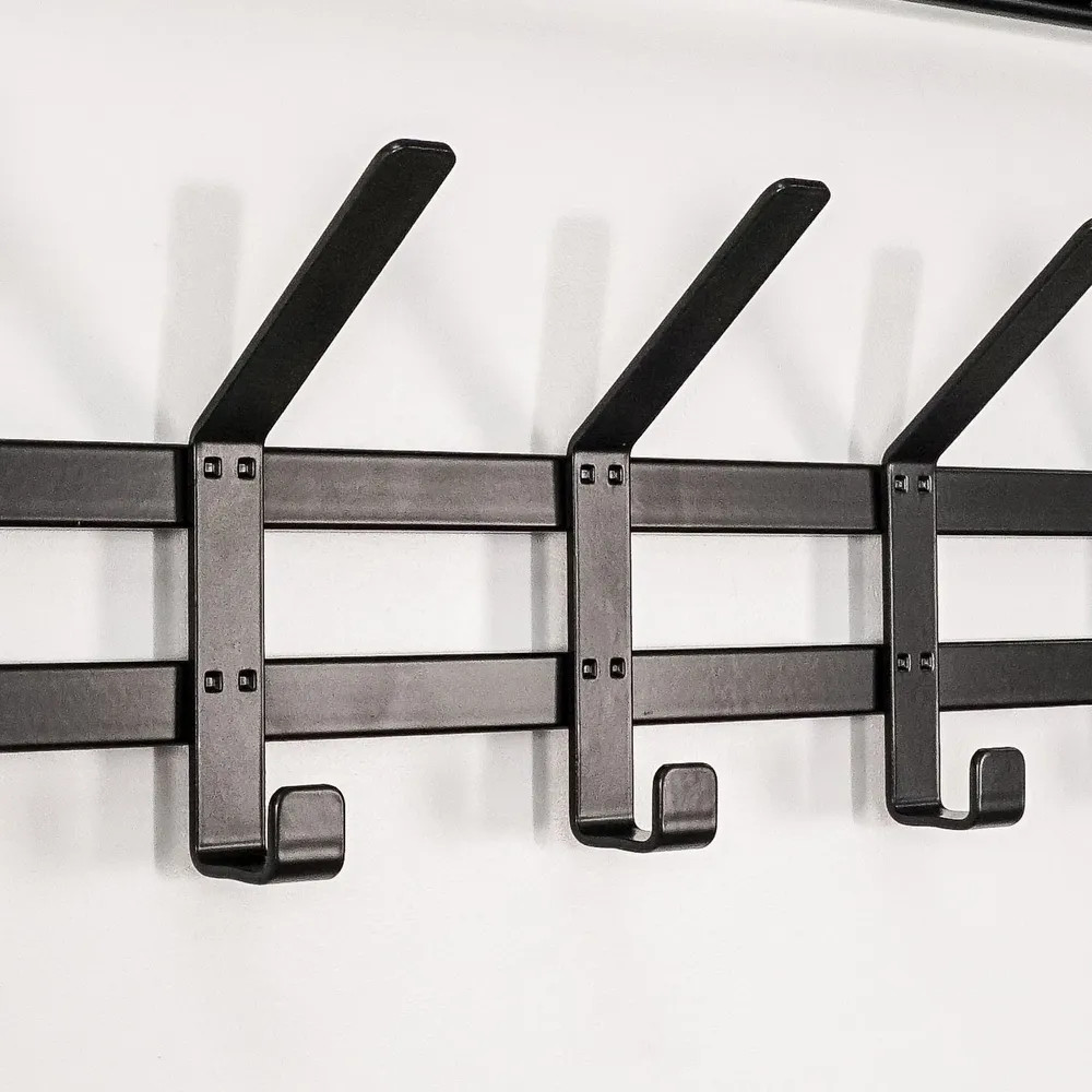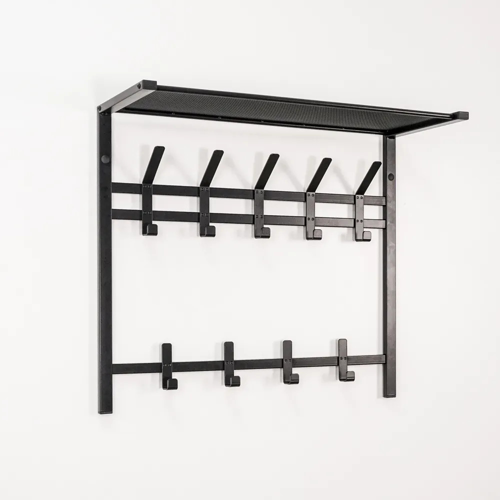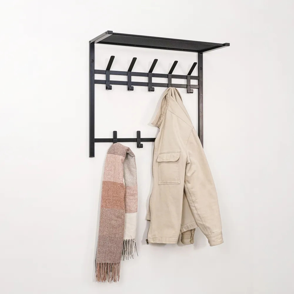 Комнатная вешалка изготовлена из прочного высококачественного материала: металла с полимерно-порошковым покрытием. Изделие долговечное и прослужит вам много лет. Оно оснащено 9 крючками, каждый из которых способен выдержать до 5 кг нагрузки. Высота сборной вешалки — 58 см. Функциональная двухуровневая система хранения — удачная дизайнерская идея для того, что бы разместить предметы вашего гардероба стильно и удобно. С помощью этой красивой железной подвесной конструкции можно хранить куртки, пальто, плащи. Довольно большая полка пригодится для шапок, курток, перчаток, зонтов. С помощью полки с несколькими крючками вы найдете место для сумок, ключей или шляпы. Кроме того, благодаря элегантной форме она украсит собой любой интерьер. Стильная навесная открытая вешалка подойдет для хранения вещей всей вашей семьи. Вы можете повесить интерьерное приспособление для комнаты взрослых, а можете разместить в детской для мальчиков или девочек. Она подойдет и для подростковой комнаты.