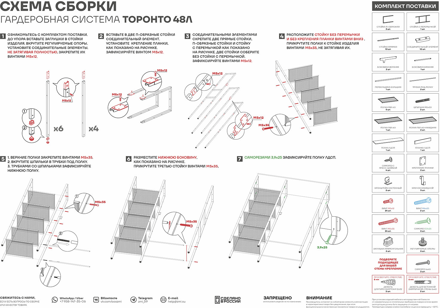 Гардеробная система «Торонто 48Л» — это функциональное и стильное решение для организации пространства в вашем доме. Она поможет вам максимально использовать свободное место и удобно хранить одежду, обувь и аксессуары. Гардеробная система «Торонто 48Л» представляет собой разборный металлический каркас из профильной трубы 25×15, полок из просечно-вытяжного листа в кантике и стальной трубы Ø10 с гайками, крючками из листового металла, перекладиной из трубы, а также полки ЛДСП толщиной 16 мм. Отличительными чертами являются 8 полок из ПВЛ и 1 полка ЛДСП, есть вешало, накладные крючки, крепление к стене. Максимальная нагрузка — до 8 кг на полку.