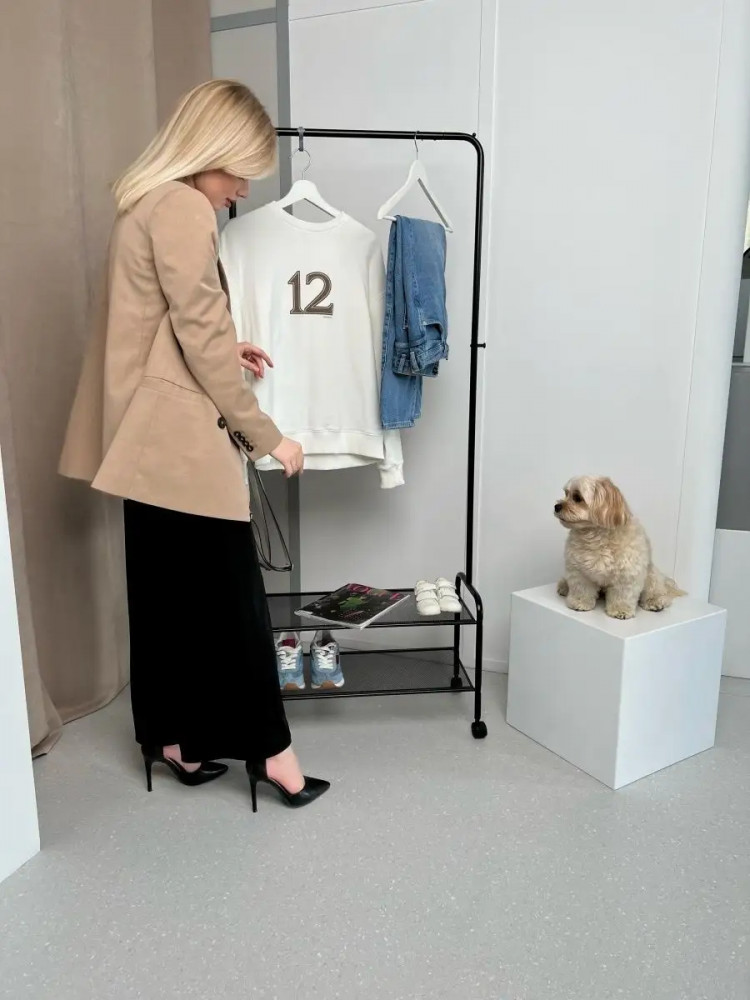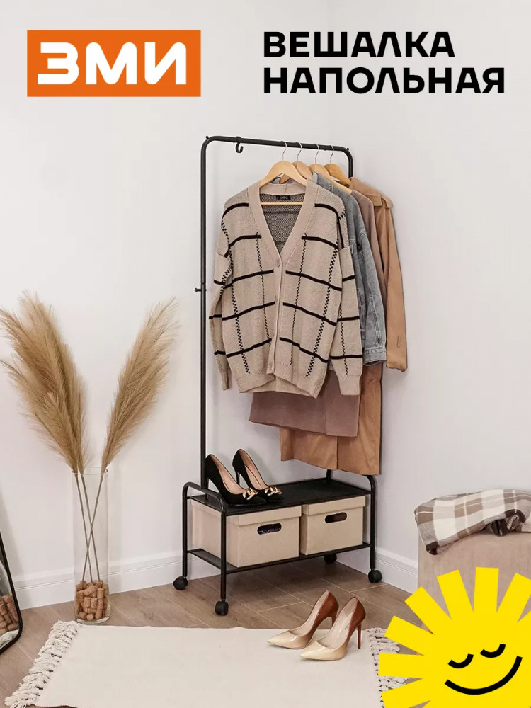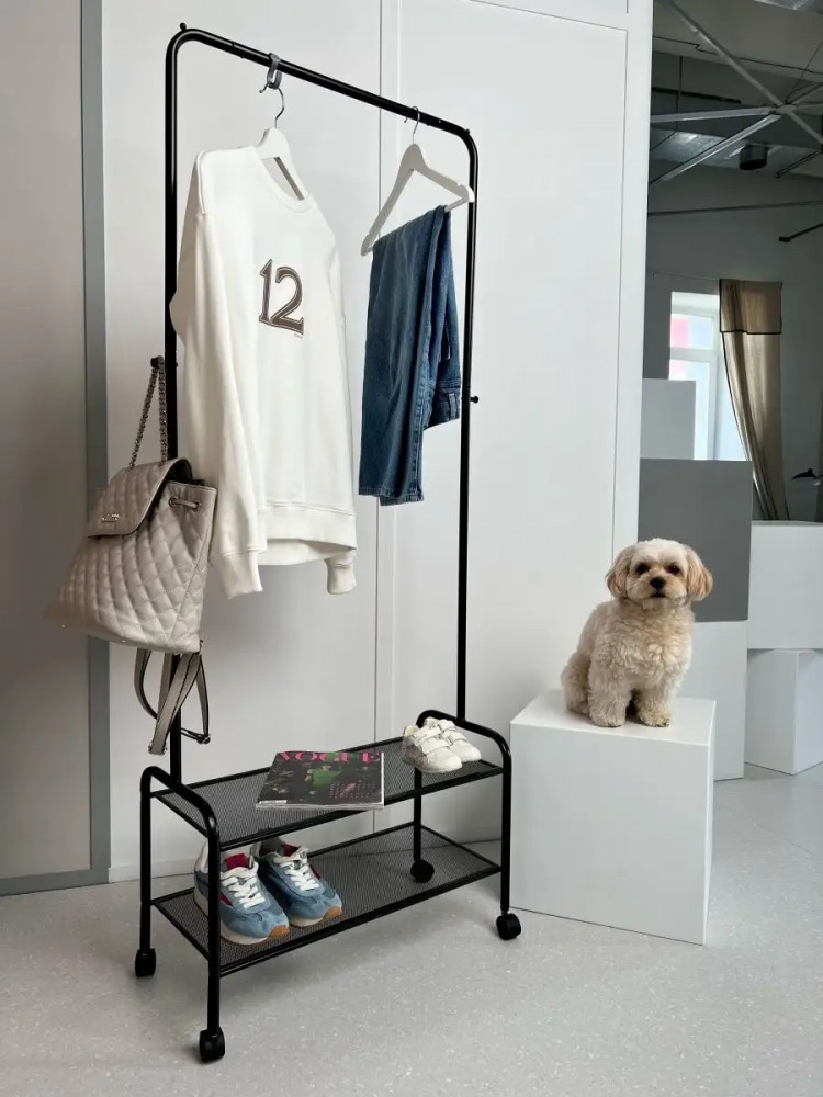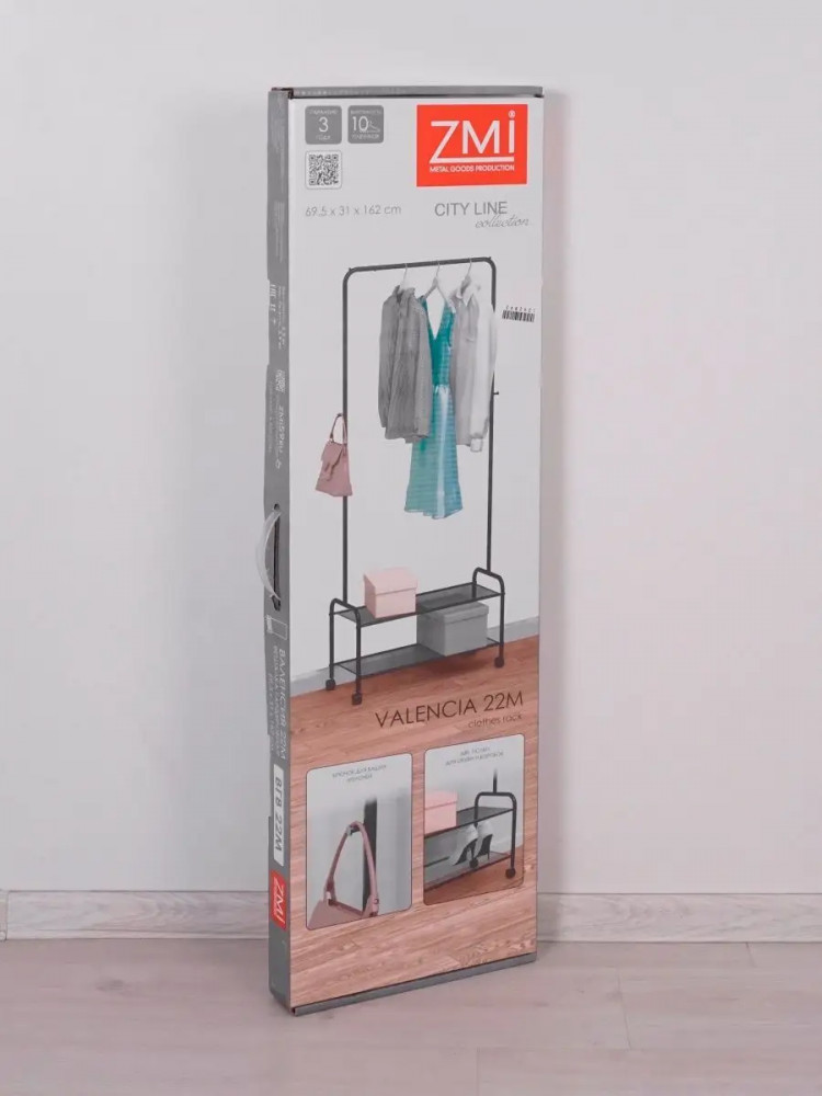 Они не будут соскальзывать на пол за счет наличия ограничителей. На стойках есть крючки, на которых можно разместить сумочки или зонтик. И еще один крючок, который фиксируется на штангу мы дарим вам для хранения различных аксессуаров. Снизу предусмотрены 2 вместительные полки — подставки под обувь, коробки и различные органайзеры. Данную модель нередко используют в качестве стойки для отпаривания одежды. Регулировка высоты перекладины не предусмотрена. Передвижную конструкцию легко перемещать, благодаря колесам на ножках, которые вращаются на 360 градусов. Она поставляется в разобранном виде в удобной упаковке с ручкой, в которой легко донести покупку из пункта выдачи до дому. Сборка осуществляется по схеме. Для этого в комплекте есть вся необходимая фурнитура. Костюмная вешалка продается напрямую от производителя, что гарантирует не только выгодную цену, но и высокое качество.