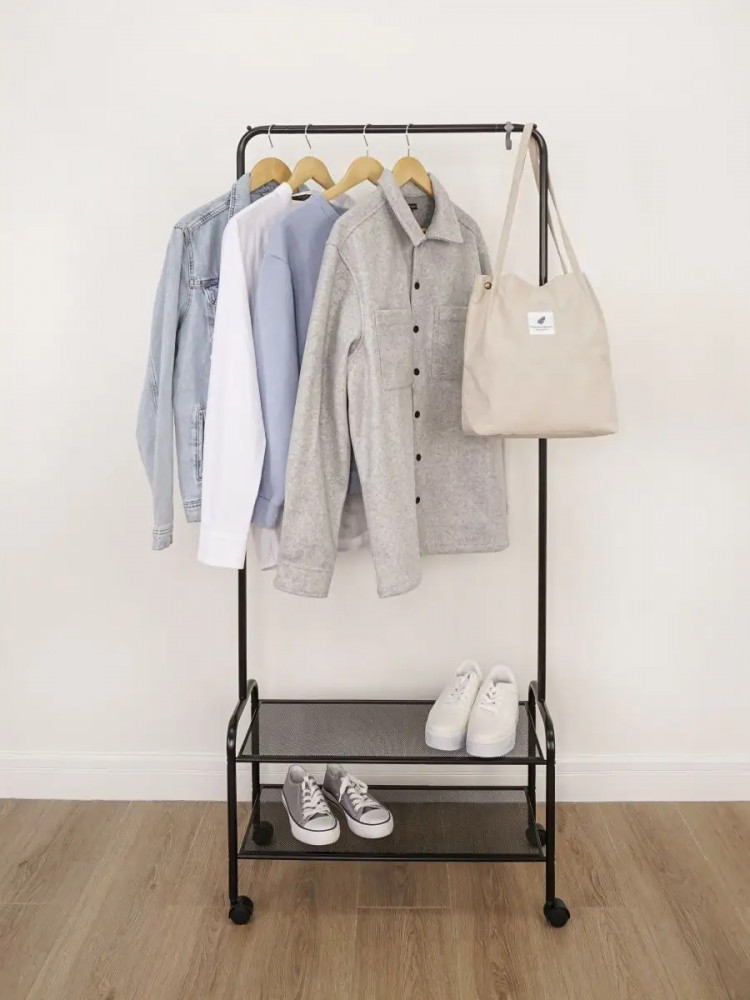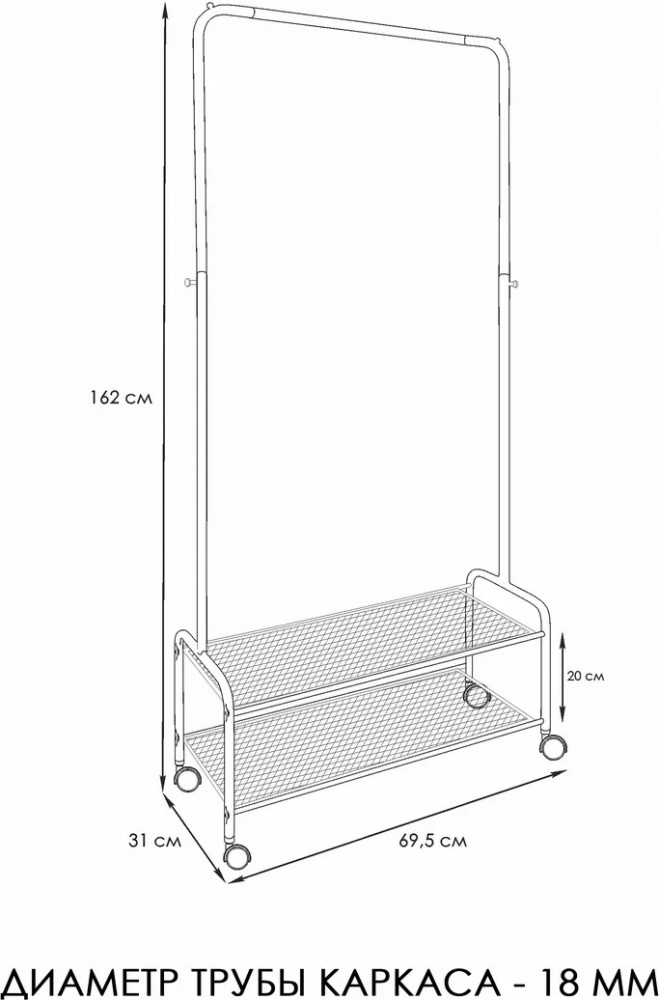 Такая металлическая гардеробная система для вещей может использоваться для организации пространства в самых разнообразных помещениях: в спальне, в ванной, детской комнате, на балконе или лоджии, офисных раздевалках и даже в магазине или салоне красоты. Ей найдется широкое применение дома, на даче и в офисе. На вешало можно разместить значительную часть гардероба: пиджаки, брюки, костюмы ребенка и различное бельё. Она поможет разгрузить или полностью заменить громоздкий шкаф. Каркас выполнен из стальной трубы диаметром 18 мм и покрыт полимерно-порошковой краской. Железная перекладина способна выдержать нагрузку до 20 кг. На ней с легкостью удастся разместить около 10-15 плечиков.