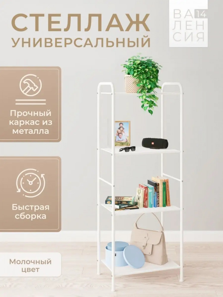 Стеллаж «Валенсия 14» представляет собой разборный металлический каркас из стальной трубы и полок ПВЛ в кантике толщиной 10 мм. Отличительными чертами являются 4 полки из ПВЛ.