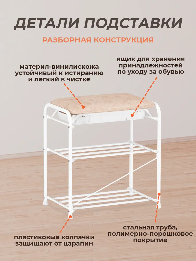 Подставка для обуви пришла упакованной в коробку, внутри в пакетике были все мелкие запчасти (упаковка заводская)-болтики, гайки, гаечный ключик и пр., т.е.все необходимое для сборки. Собирается без дополнительных инструментов, собрала сама за пол часа. Сделано качественно, сиденье обтянуто плотно, все целое, без царапин и пр. Смотрится красиво. Под весом человека не скрипнуло, не пошатнулось, стоит устойчиво. Рекомендую. Спасибо.