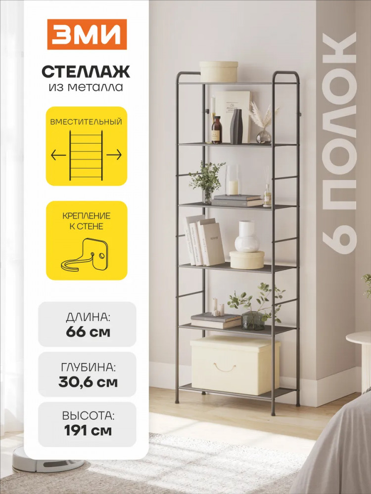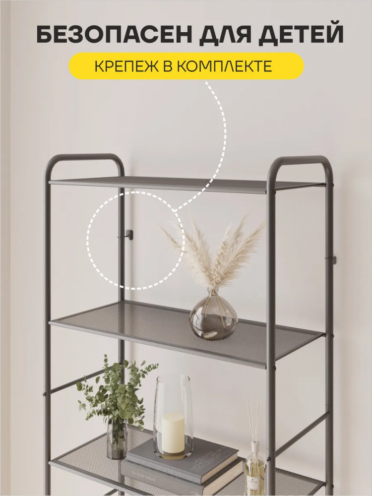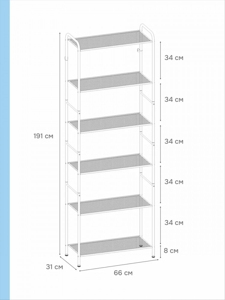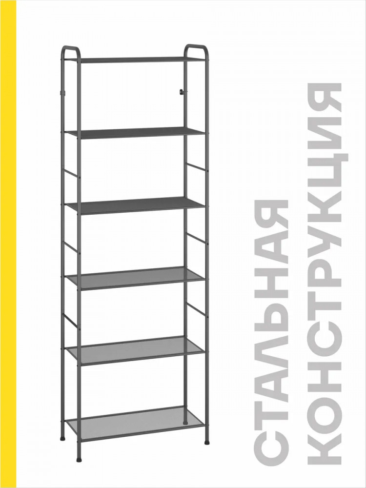 Изделие предназначено для хранения домашних и офисных предметов. Представляет собой стеллаж с шестью полками, выполненными из просечно-вытяжного листа. Разборный каркас состоит из стальной трубы. Все изделие окрашено однотонной, порошковой краской. В комплект входят регулируемые пластиковые ножки. Допустимая нагрузка на полки 8 кг.