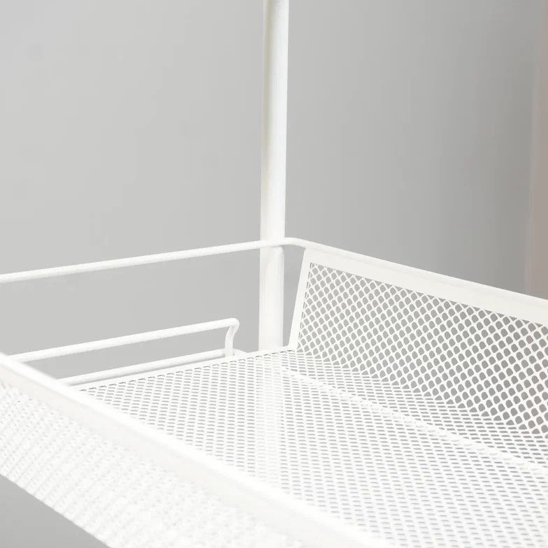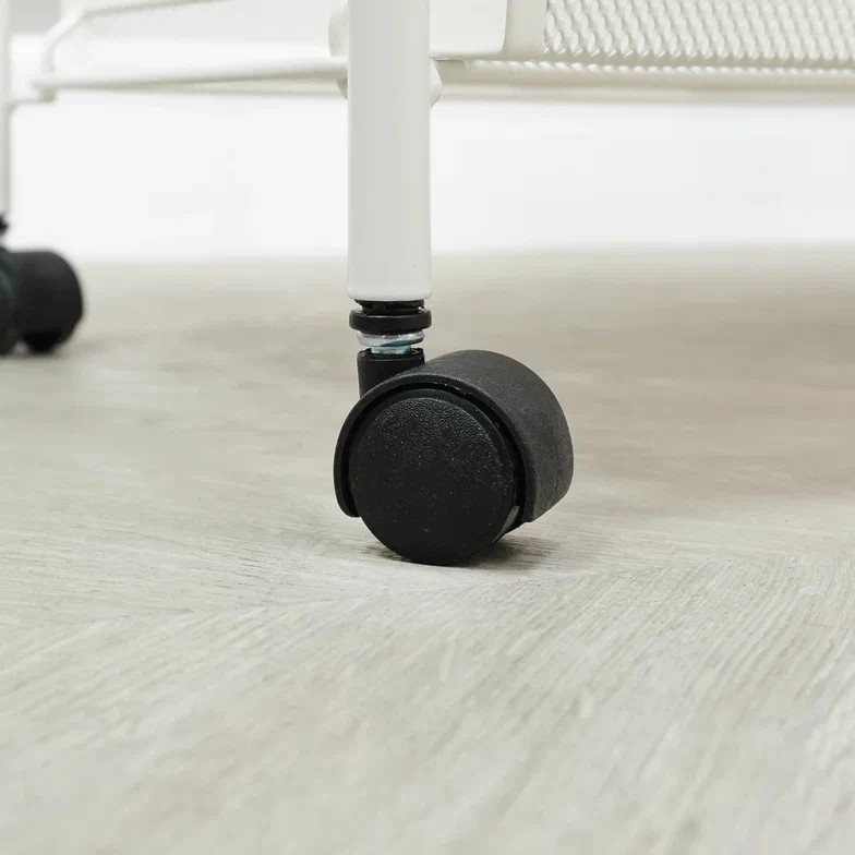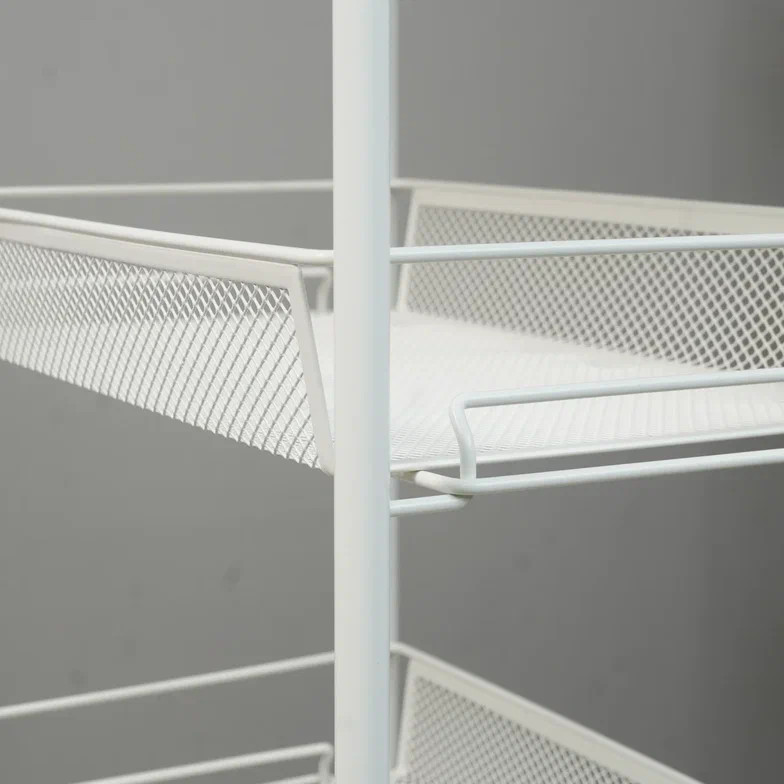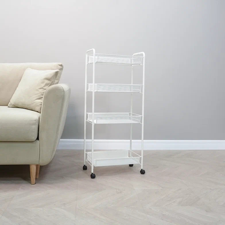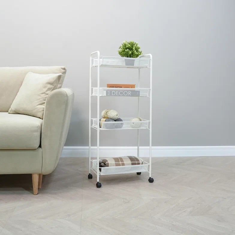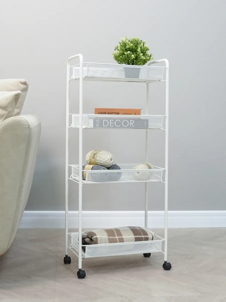 Узкая модель обладает компактными размерами и легко может разместиться в ограниченном пространстве. В органайзере предусмотрено четыре корзины. Все они способны выдержать вес до 10 кг. На таких полочках легко можно разместить бытовую химию, женскую и мужскую косметику, книги, игрушки, овощи и фрукты, даже цветы. Комплект дополнен пластиковым крючком. На этом крючке удобно хранить кухонные полотенца. Соответственно, вы с легкостью сможете выбрать вариант, идеально вписывающийся в интерьерный дизайн. Прочный стеллаж оснащен колесиками, благодаря которому его удобно передвигать. Он поставляется в разобранном виде в картонной упаковке, оснащенной ручкой.