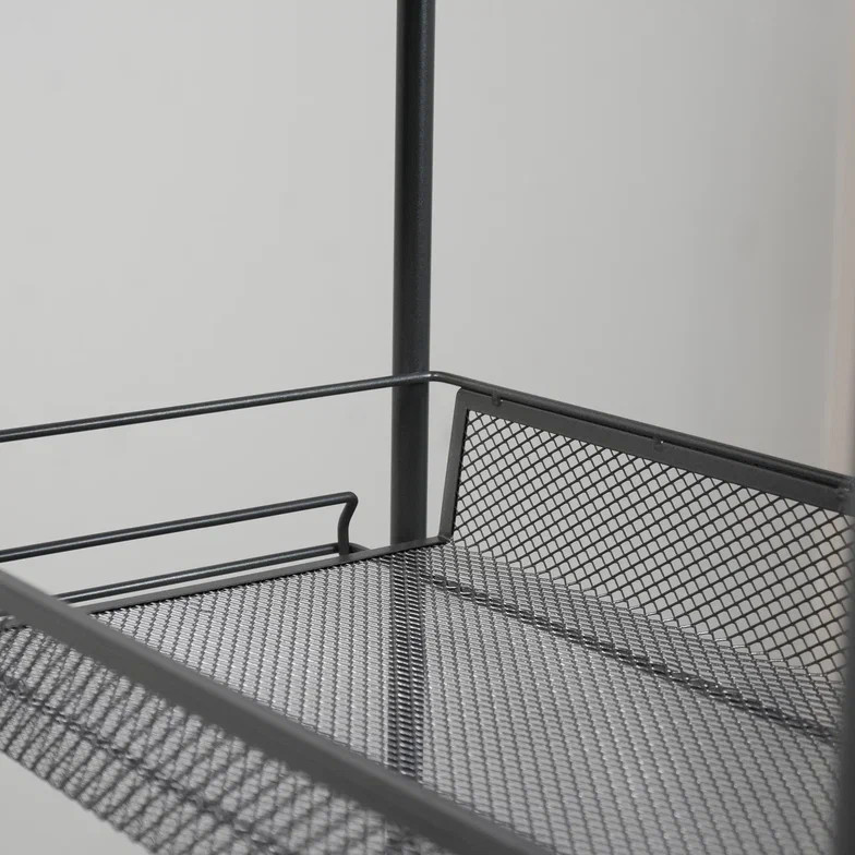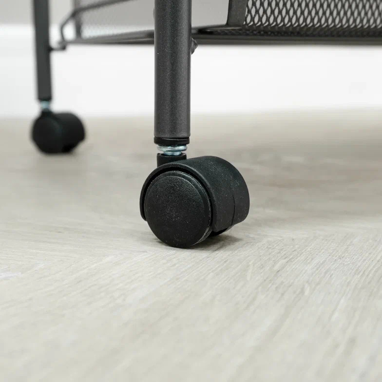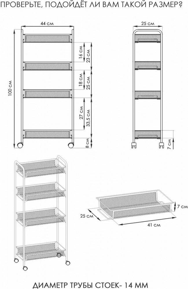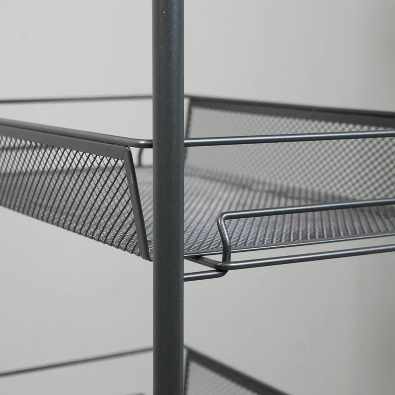 Узкая модель обладает компактными размерами и легко может разместиться в ограниченном пространстве. В органайзере предусмотрено четыре корзины. Все они способны выдержать вес до 10 кг. На таких полочках легко можно разместить бытовую химию, женскую и мужскую косметику, книги, игрушки, овощи и фрукты, даже цветы. Комплект дополнен пластиковым крючком. На этом крючке удобно хранить кухонные полотенца. Соответственно, вы с легкостью сможете выбрать вариант, идеально вписывающийся в интерьерный дизайн. Прочный стеллаж оснащен колесиками, благодаря которому его удобно передвигать. Он поставляется в разобранном виде в картонной упаковке, оснащенной ручкой.