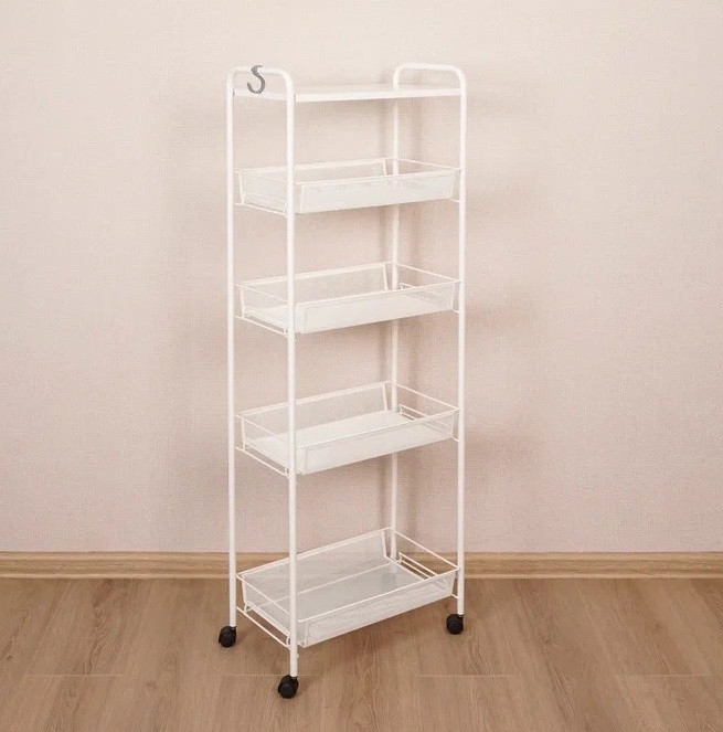 Модель с металлическим каркасом и сетчатыми железными корзиночками покрыта полимерной краской. За счет этого она надолго сохранит красивый первозданный вид. Органайзер обладает компактными размерами, небольшой шириной и легко помещается даже в ограниченном пространстве. Универсальная мебель оснащена четырьмя корзинами, которые выдерживают вес до 10 кг, и металлическим столиком. На них легко поместятся кухонные принадлежности, специи, овощи и фрукты. В ванной и туалете передвижной стеллаж можно использовать для бытовой химии, расчесок, моющих, туалетных и косметических средств. Также изделие подойдет для цветочных горшков, книг, игрушек ребенка. Верхняя металлическая полочка-столик делает данную сборную конструкцию максимально функциональной. В комплекте прилагается дополнительный аксессуар в виде пластикового крючка. Сборка осуществляется невероятно легко. Чтобы собрать этажерку, даже не потребуются дополнительные инструменты. Она поставляется в картонной упаковке, на которой предусмотрена удобная ручка.