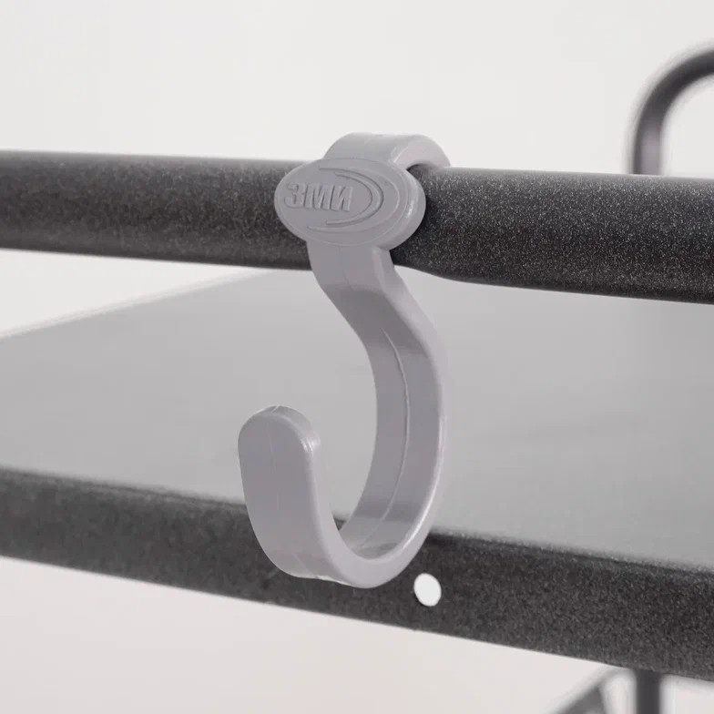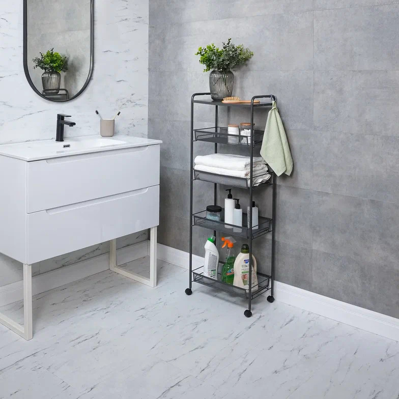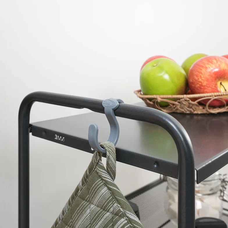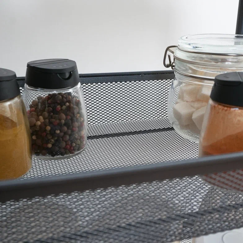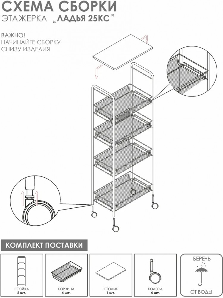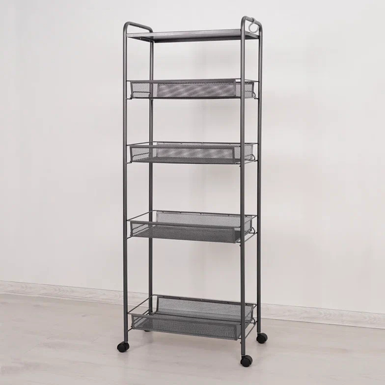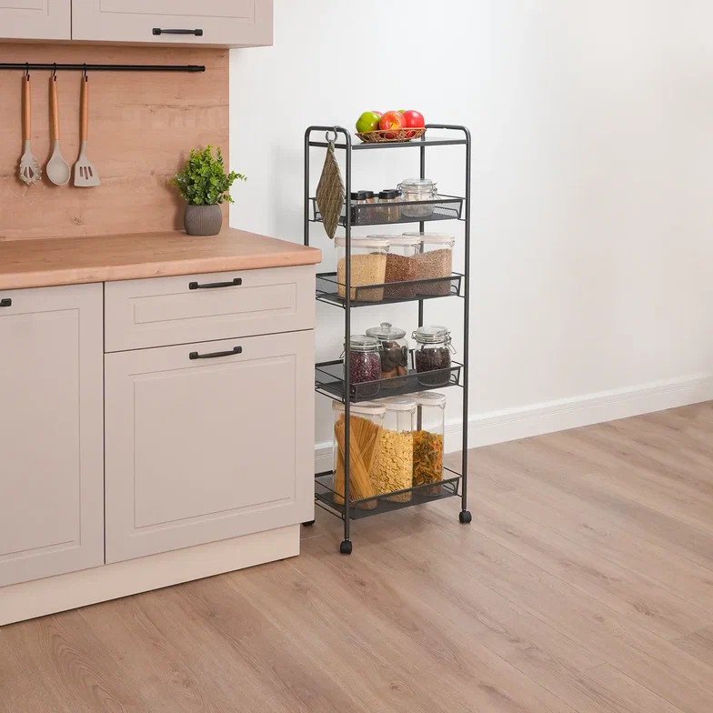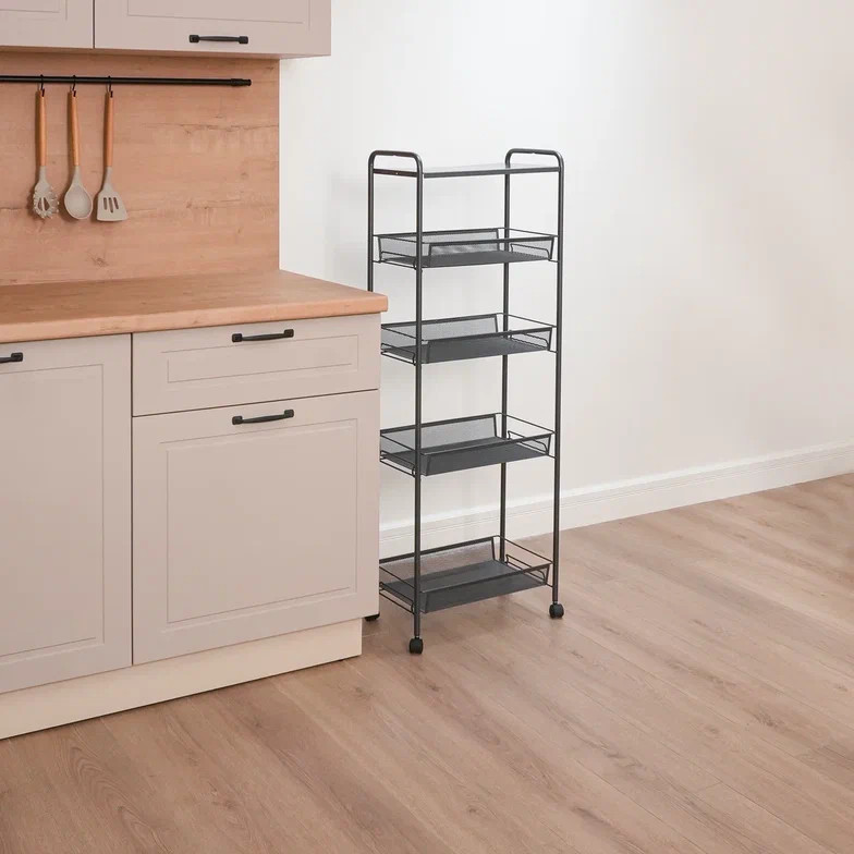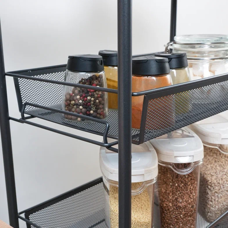 Модель с металлическим каркасом и сетчатыми железными корзиночками покрыта полимерной краской. За счет этого она надолго сохранит красивый первозданный вид. Органайзер обладает компактными размерами, небольшой шириной и легко помещается даже в ограниченном пространстве. Универсальная мебель оснащена четырьмя корзинами, которые выдерживают вес до 10 кг, и металлическим столиком. На них легко поместятся кухонные принадлежности, специи, овощи и фрукты. В ванной и туалете передвижной стеллаж можно использовать для бытовой химии, расчесок, моющих, туалетных и косметических средств. Также изделие подойдет для цветочных горшков, книг, игрушек ребенка. Верхняя металлическая полочка-столик делает данную сборную конструкцию максимально функциональной. В комплекте прилагается дополнительный аксессуар в виде пластикового крючка. Сборка осуществляется невероятно легко. Чтобы собрать этажерку, даже не потребуются дополнительные инструменты. Она поставляется в картонной упаковке, на которой предусмотрена удобная ручка.