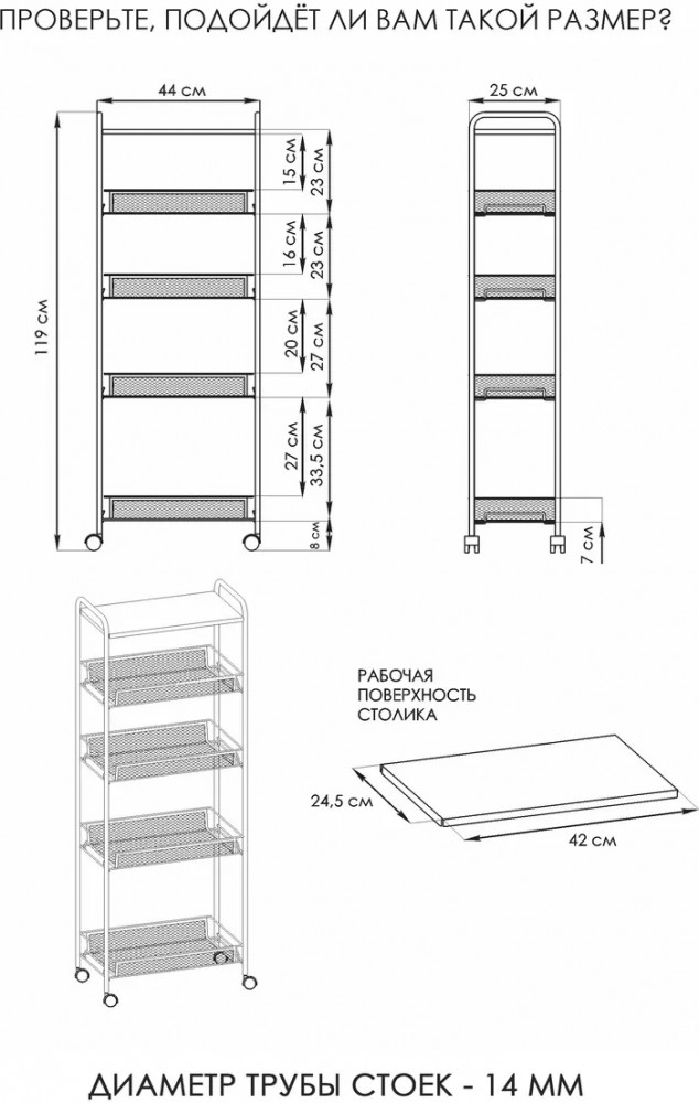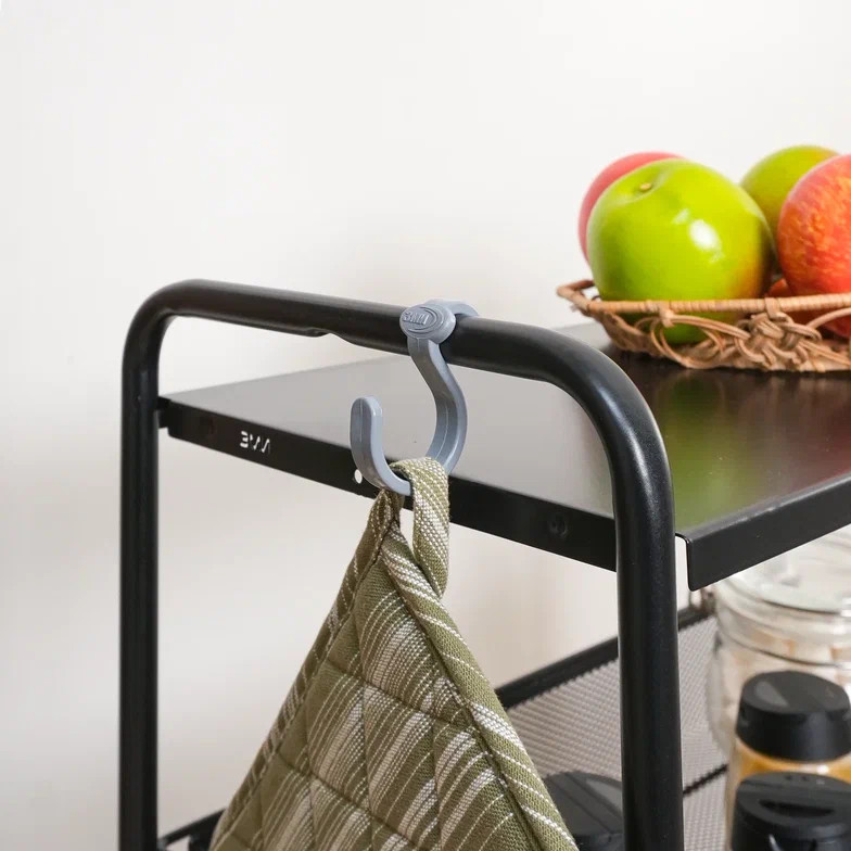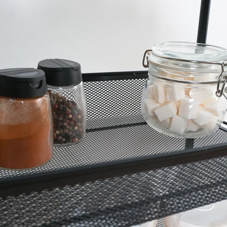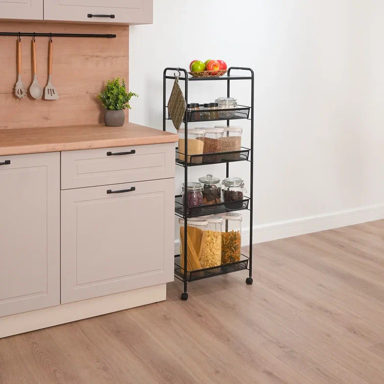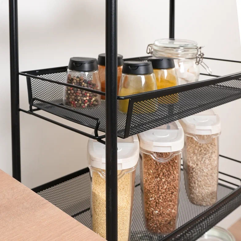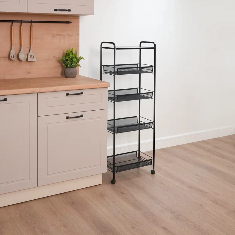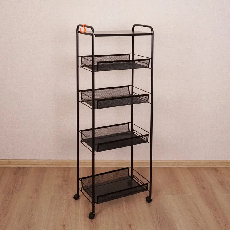 Модель с металлическим каркасом и сетчатыми железными корзиночками покрыта полимерной краской. За счет этого она надолго сохранит красивый первозданный вид. Органайзер обладает компактными размерами, небольшой шириной и легко помещается даже в ограниченном пространстве. Универсальная мебель оснащена четырьмя корзинами, которые выдерживают вес до 10 кг, и металлическим столиком. На них легко поместятся кухонные принадлежности, специи, овощи и фрукты. В ванной и туалете передвижной стеллаж можно использовать для бытовой химии, расчесок, моющих, туалетных и косметических средств. Также изделие подойдет для цветочных горшков, книг, игрушек ребенка. Верхняя металлическая полочка-столик делает данную сборную конструкцию максимально функциональной. В комплекте прилагается дополнительный аксессуар в виде пластикового крючка. Сборка осуществляется невероятно легко. Чтобы собрать этажерку, даже не потребуются дополнительные инструменты. Она поставляется в картонной упаковке, на которой предусмотрена удобная ручка.