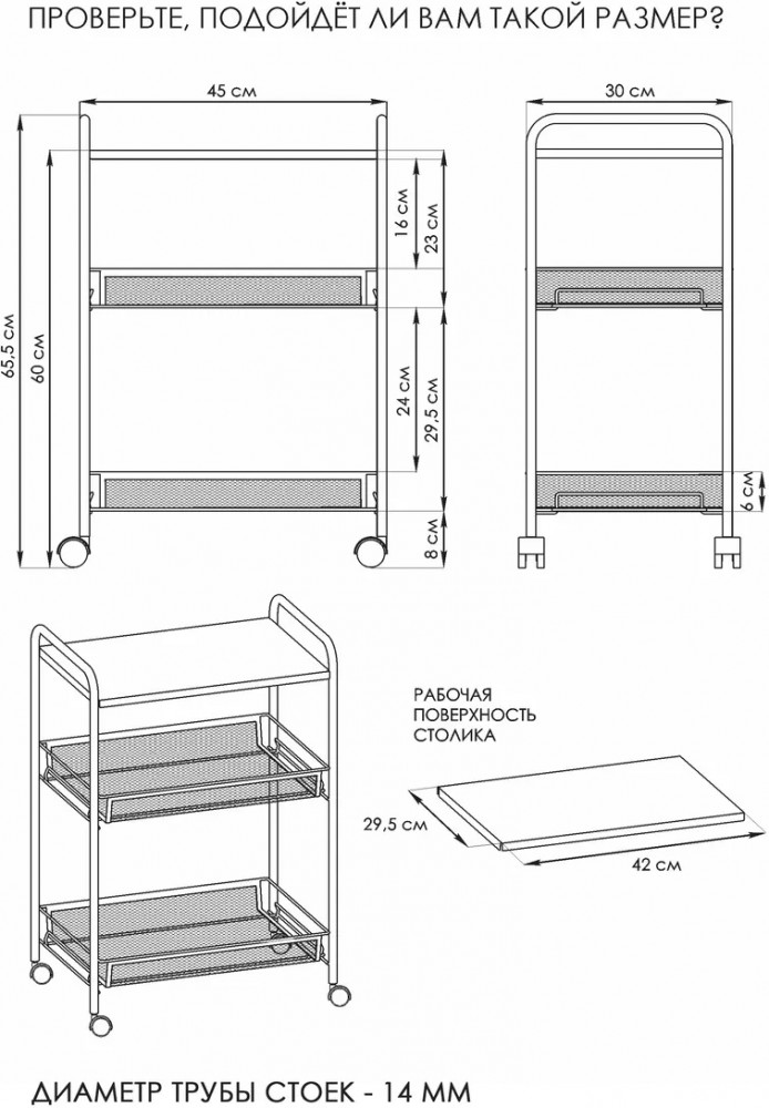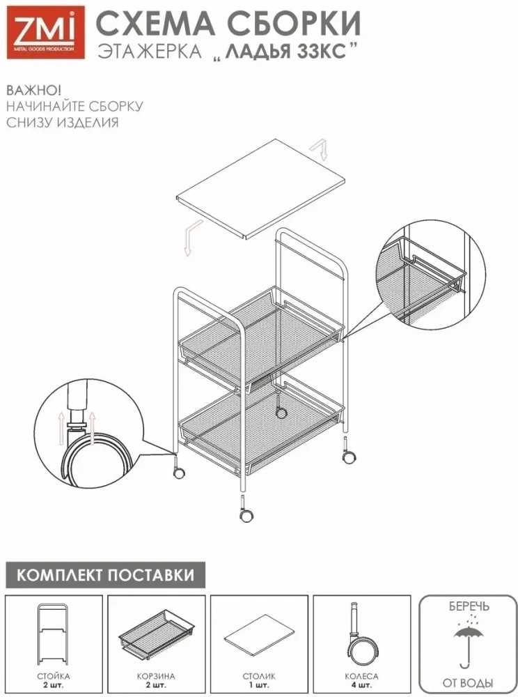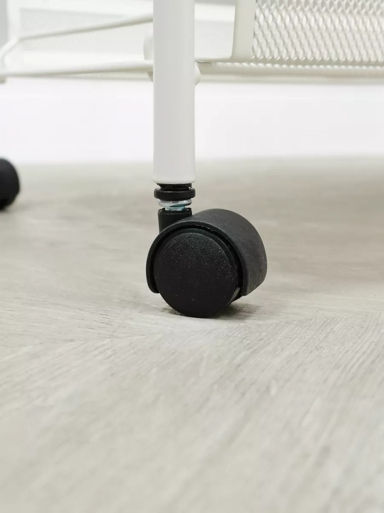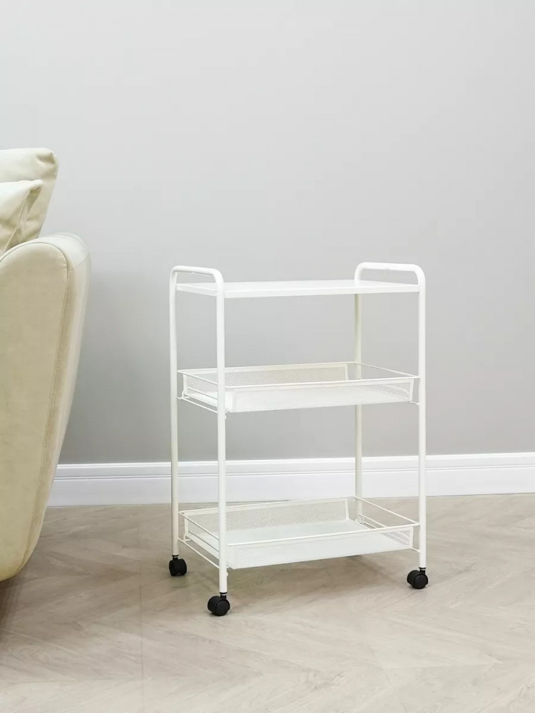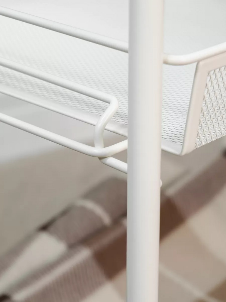 Модель с металлическим каркасом и сетчатыми железными корзиночками покрыта полимерной краской. За счет этого она надолго сохранит красивый первозданный вид. Органайзер обладает компактными размерами, небольшой шириной и легко помещается даже в ограниченном пространстве. Универсальная мебель оснащена двумя корзинами, которые выдерживают вес до 10 кг. На них легко поместятся кухонные принадлежности, специи, овощи и фрукты. В ванной и туалете передвижной стеллаж можно использовать для бытовой химии, расчесок, моющих туалетных и косметических средств. Также изделие подойдет для цветочных горшков, книг, игрушек ребенка. Верхняя металлическая полочка-столик делает данную сборную конструкцию максимально функциональной. В комплекте прилагается дополнительный аксессуар в виде пластикового крючка. Сборка осуществляется невероятно легко. Чтобы собрать этажерку, даже не потребуются дополнительные инструменты. Она поставляется в картонной упаковке, на которой предусмотрена удобная ручка.