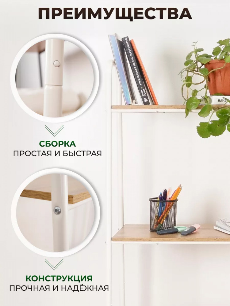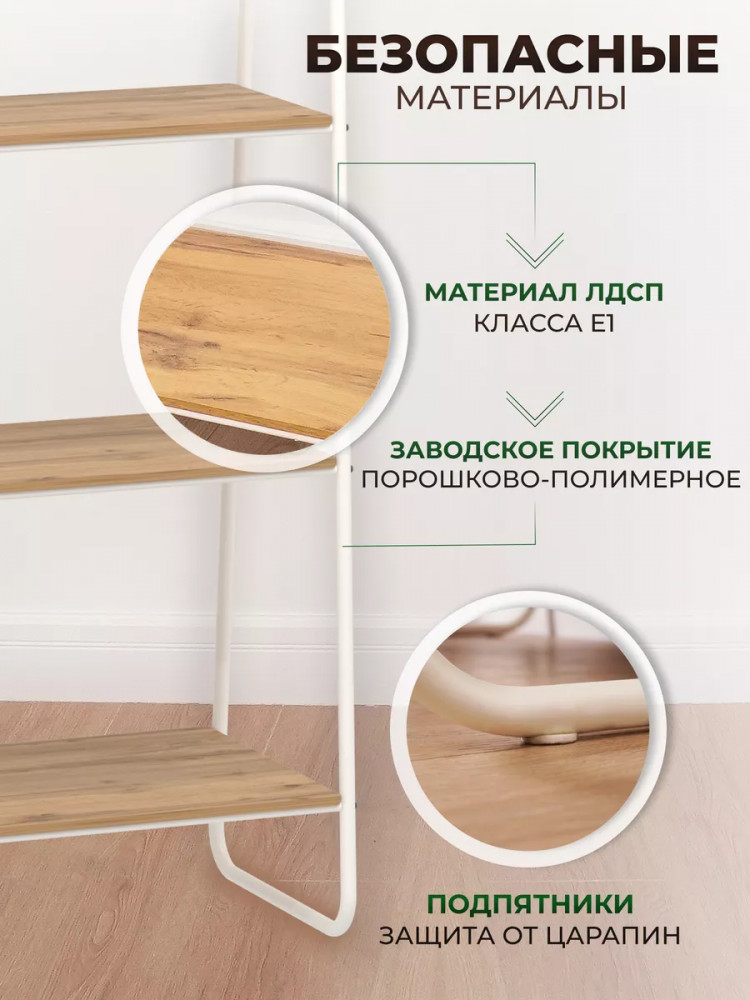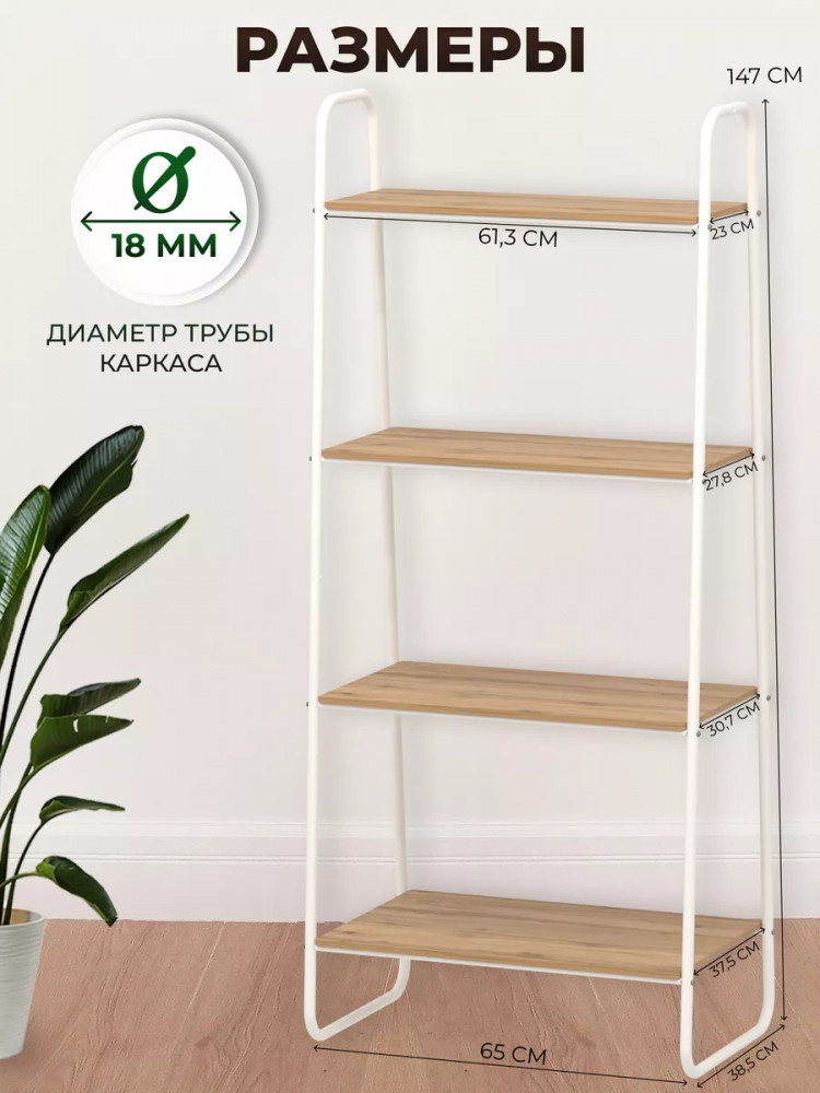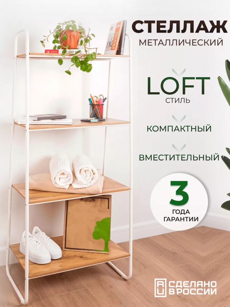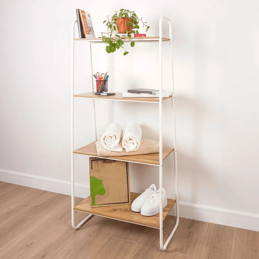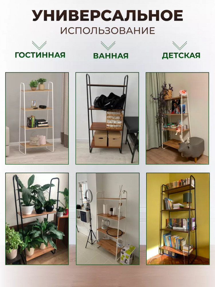Открытый комнатный стеллаж имеет надежные крепления. Деревянные полочки из ЛДСП выдержат нагрузку до 8 кг. Этот универсальный мебельный предмет компактен, его можно переместить в любую часть дома или дачи. Поставьте сборный стеллаж из металла в комнату вашей квартиры: гостиную, кухню, гардеробную, детскую, спальню, коридор. Она будет уместна для комнаты мужчин, женщин и детей. Эта вещь хороша не только для домашнего пользования всей семьи. Благодаря минималистичному красивому дизайну разборная этажерка добавит уют в любое офисное помещение или дачный дом. Бытовой интерьерный стеллаж станет декором в балконном или комнатном пространстве. Его можно использовать как книжный шкаф или хранить продукты. Эта конструкция - нужная вещь для пользования взрослыми людьми и маленькими детьми. Система хранения имеет практичные высоту и ширину, за счет чего подойдет для хранения вещей школьника: пенала, учебников, одежды.
