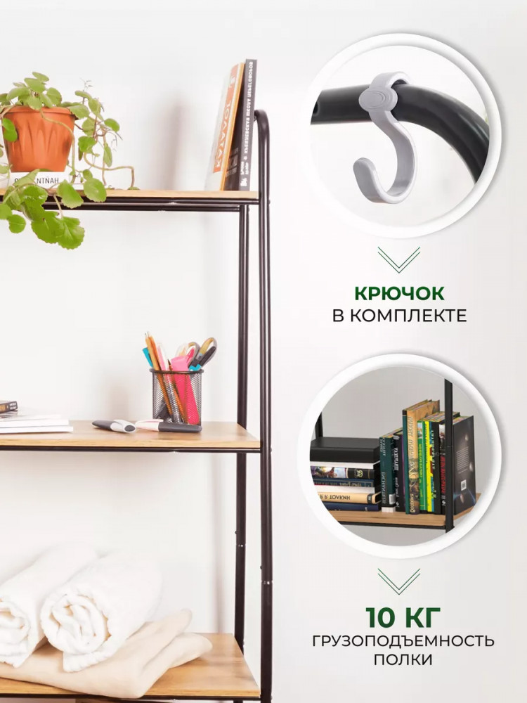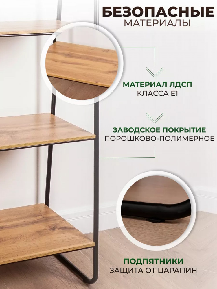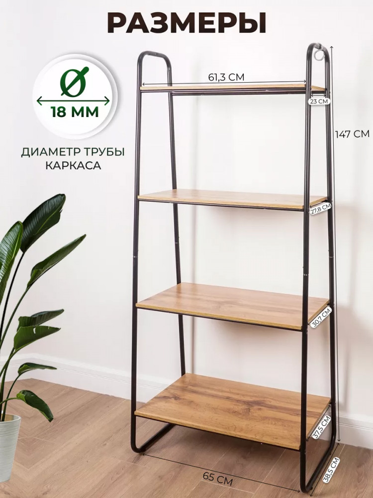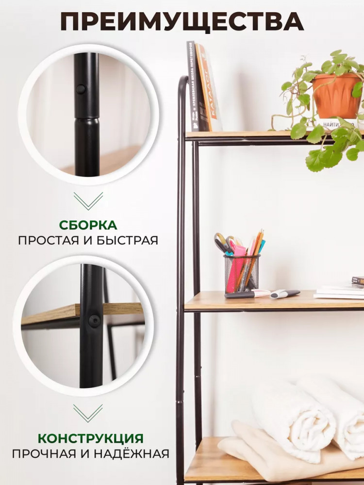 Открытый комнатный стеллаж имеет надежные крепления. Деревянные полочки из ЛДСП выдержат нагрузку до 8 кг. Этот универсальный мебельный предмет компактен, его можно переместить в любую часть дома или дачи. Поставьте сборный стеллаж из металла в комнату вашей квартиры: гостиную, кухню, гардеробную, детскую, спальню, коридор. Она будет уместна для комнаты мужчин, женщин и детей. Эта вещь хороша не только для домашнего пользования всей семьи. Благодаря минималистичному красивому дизайну разборная этажерка добавит уют в любое офисное помещение или дачный дом. Бытовой интерьерный стеллаж станет декором в балконном или комнатном пространстве. Его можно использовать как книжный шкаф или хранить продукты. Эта конструкция - нужная вещь для пользования взрослыми людьми и маленькими детьми. Система хранения имеет практичные высоту и ширину, за счет чего подойдет для хранения вещей школьника: пенала, учебников, одежды.