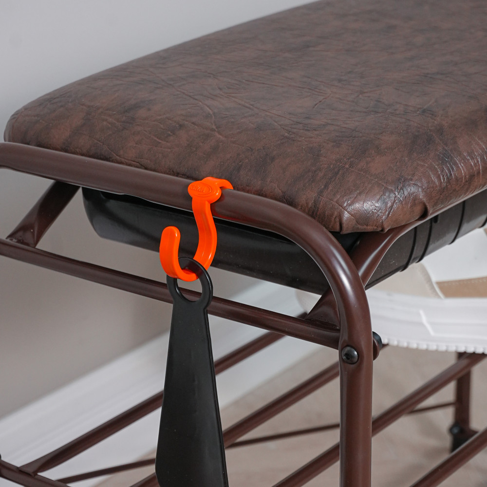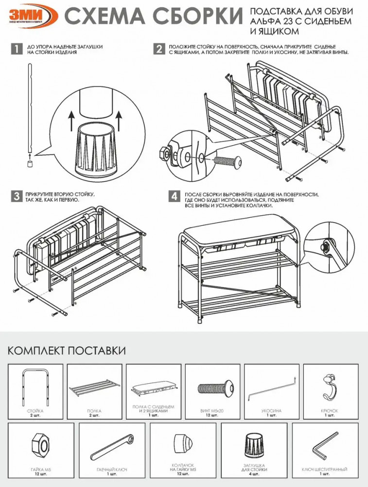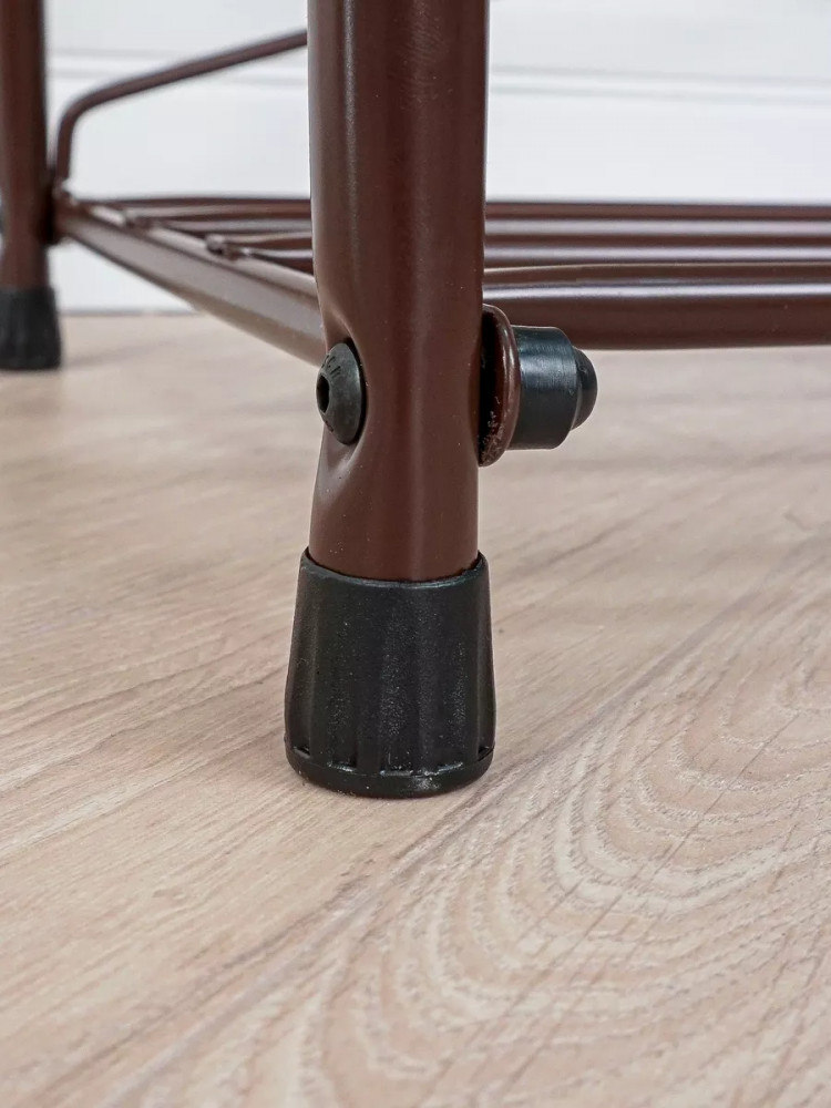 Этажерка выполнена из прочной металлической трубы диаметром 16 мм, что гарантирует ее долговечность и надежность. Она имеет две полки, на которых без труда можно разместить до 6 пар обуви. Кроме того, каждая полочка способна выдерживать нагрузку до 8 кг, что обеспечит надежную поддержку вашей обуви. Заглушки на ножках защищают пол от царапин. Галошница Альфа 23СЯ продается в разобранном виде в картонной коробке с ручкой для удобства транспортировки. Для ее сборки в комплекте есть инструмент и вся необходимая фурнитура.