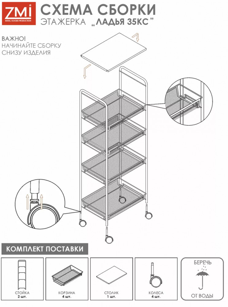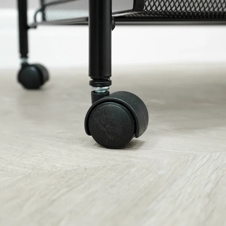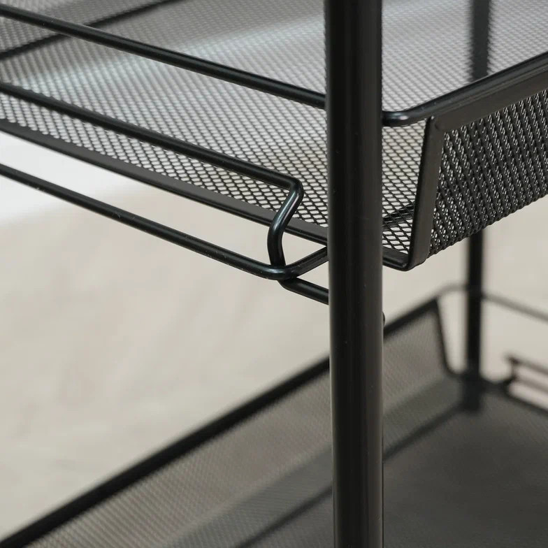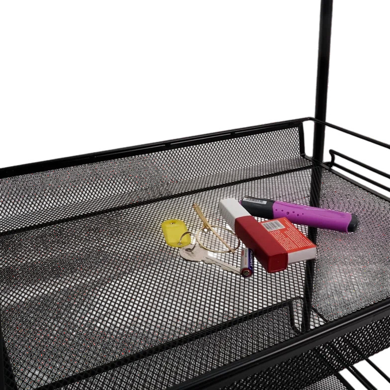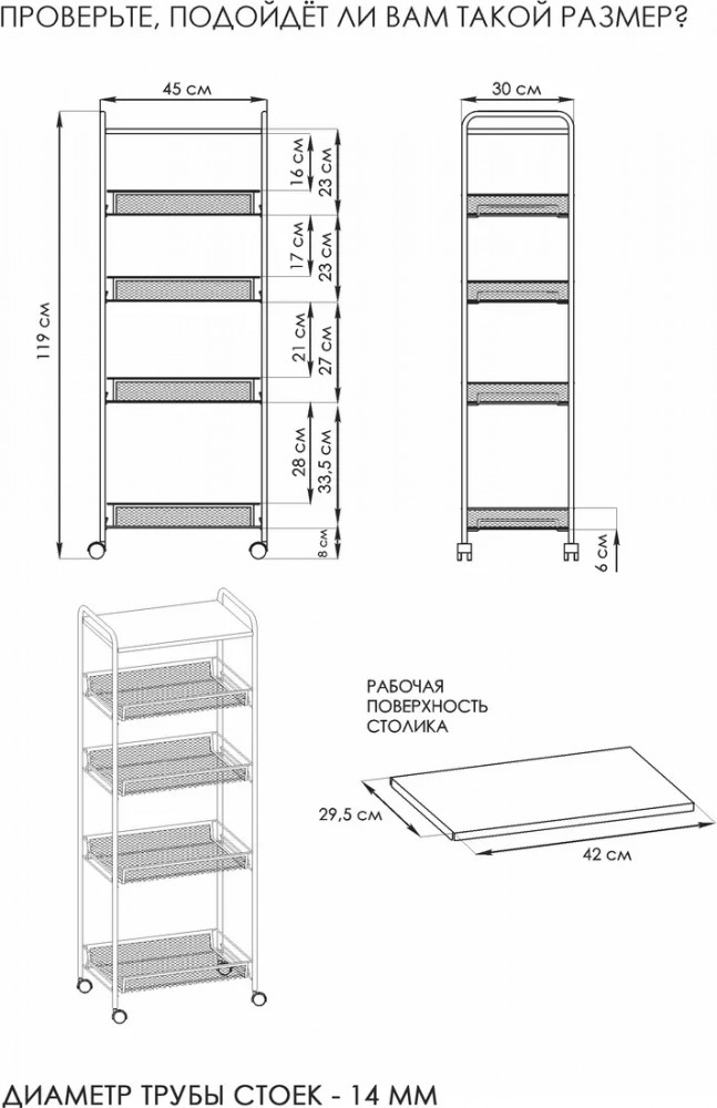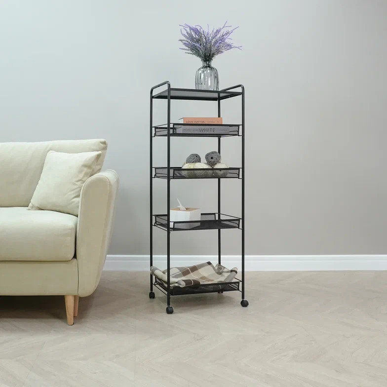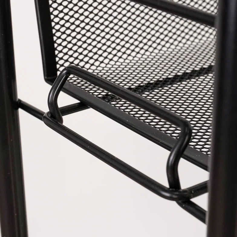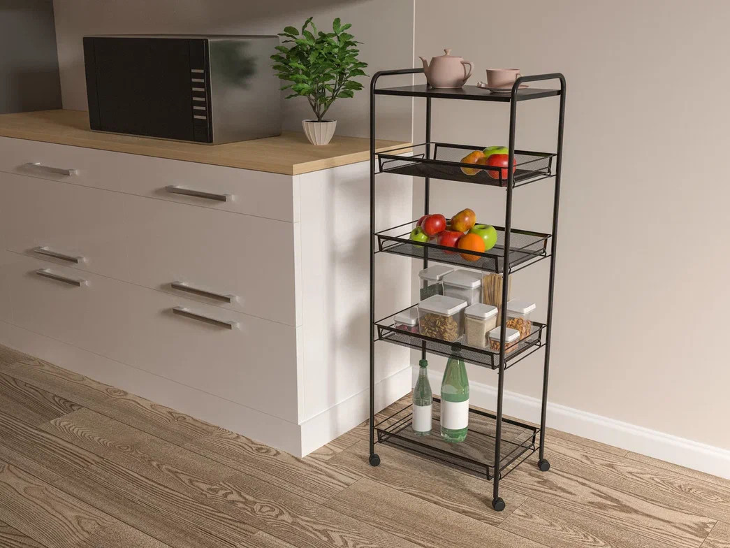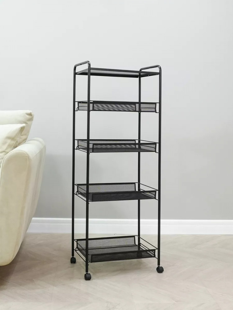 Модель с металлическим каркасом и сетчатыми железными корзиночками покрыта полимерной краской. За счет этого она надолго сохранит красивый первозданный вид. Органайзер обладает компактными размерами, небольшой шириной и легко помещается даже в ограниченном пространстве. Универсальная мебель оснащена четырьмя корзинами, которые выдерживают вес до 10 кг, и металлическим столиком. На них легко поместятся кухонные принадлежности, специи, овощи и фрукты. В ванной и туалете передвижной стеллаж можно использовать для бытовой химии, расчесок, моющих, туалетных и косметических средств. Также изделие подойдет для цветочных горшков, книг, игрушек ребенка. Верхняя металлическая полочка-столик делает данную сборную конструкцию максимально функциональной. В комплекте прилагается дополнительный аксессуар в виде пластикового крючка. Сборка осуществляется невероятно легко. Чтобы собрать этажерку, даже не потребуются дополнительные инструменты. Она поставляется в картонной упаковке, на которой предусмотрена удобная ручка.