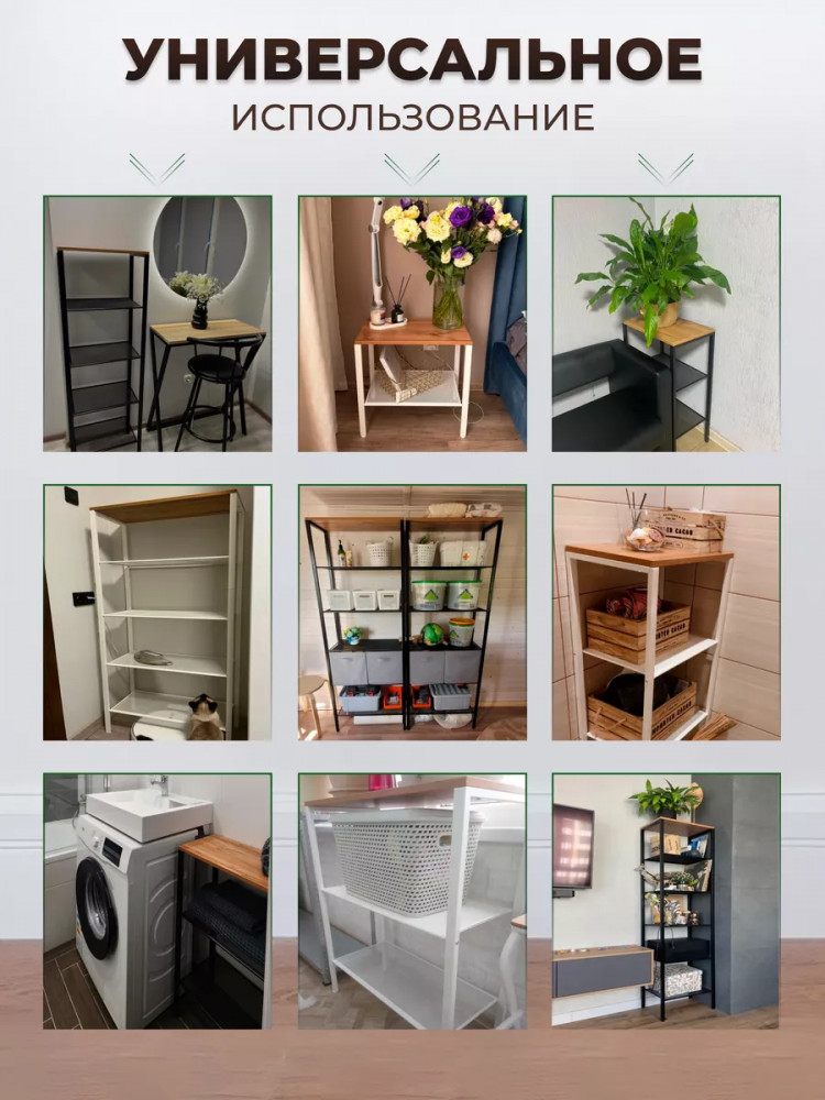 Этот универсальный мебельный предмет компактен, его можно переместить в любую часть дома или дачи. Поставьте сборный стеллаж из металла в комнату вашей квартиры: гостиную, кухню, гардеробную, детскую, спальню, коридор. Она будет уместна для комнаты мужчин, женщин и детей. Эта вещь хороша не только для домашнего пользования всей семьи. Благодаря минималистичному красивому дизайну разборная этажерка добавит уют в любое офисное помещение или дачный дом. Бытовой интерьерный стеллаж станет декором в балконном или комнатном пространстве. Его можно использовать как книжный шкаф или хранить продукты. Эта конструкция — нужная вещь для пользования взрослыми людьми и маленькими детьми. Система хранения имеет практичные высоту и ширину, за счет чего подойдет для хранения вещей школьника: пенала, учебников, одежды. Используйте ее как большой органайзер для канцелярских принадлежностей, фотографий, документов. Храните книжки, украшения, аксессуары, сувениры. Вы можете разместить на полочках сезонный инвентарь для ухода за цветочными растениями. А можете поставить стеллаж на кухне и использовать для банок и посуды. Изделие подойдет для обуви, вещей и одежды.