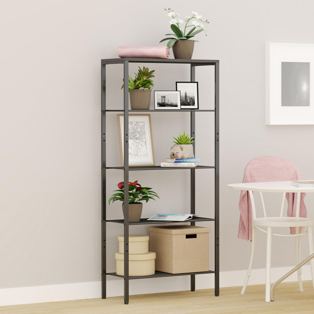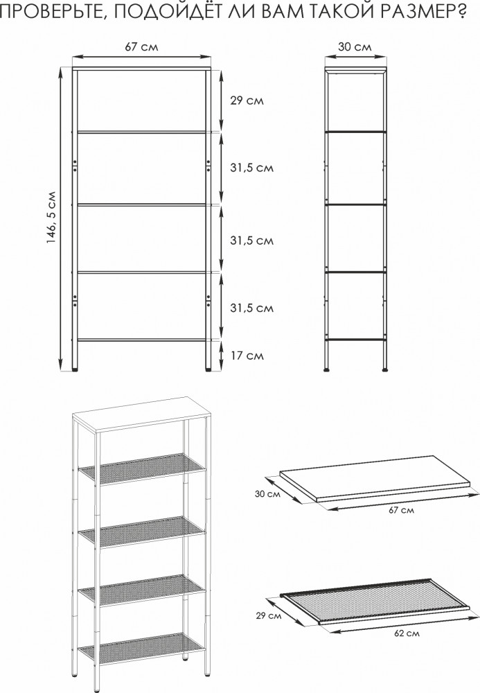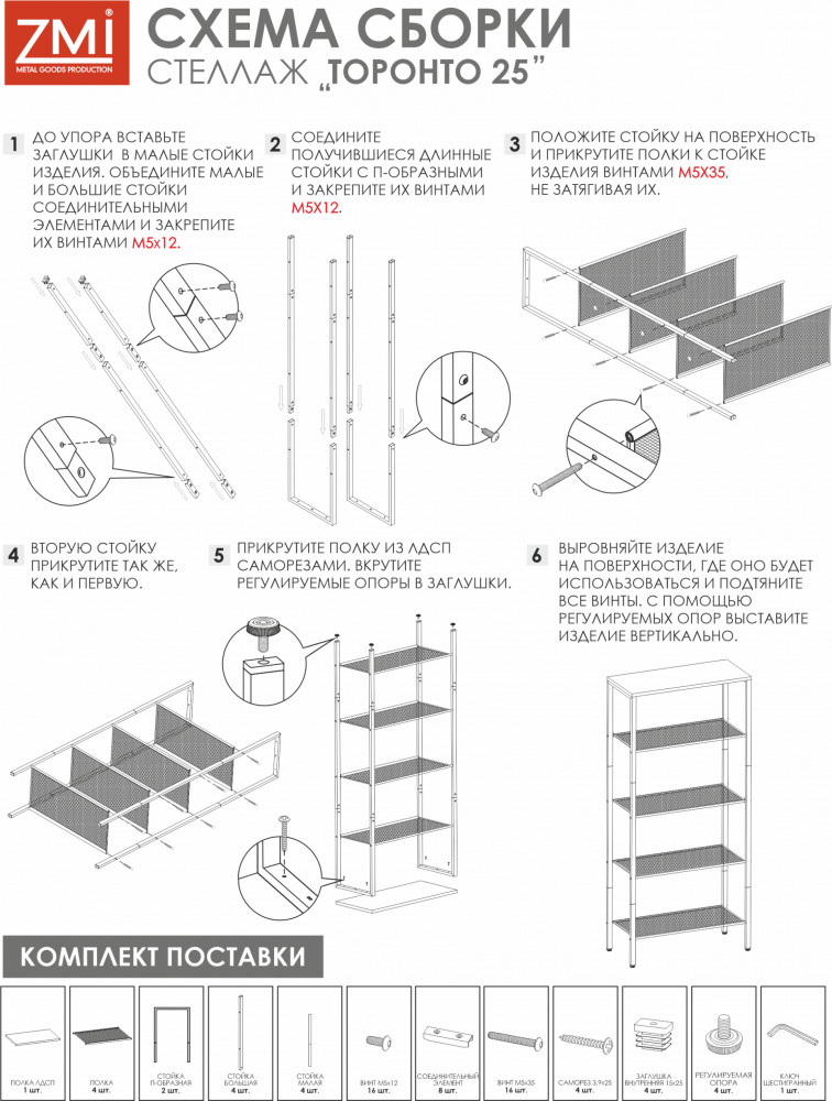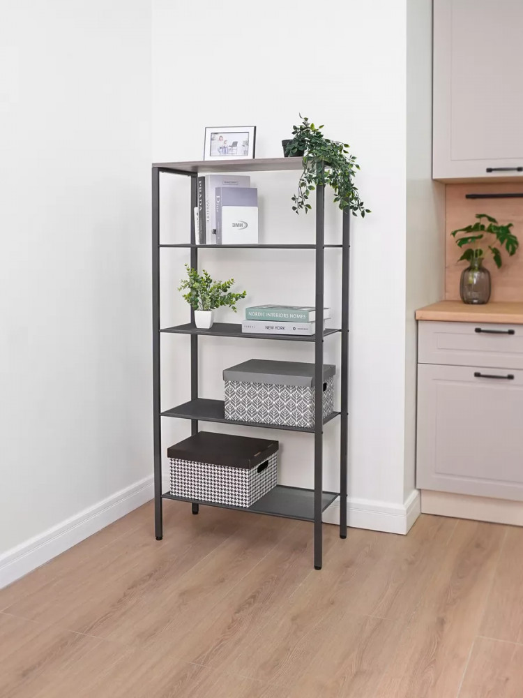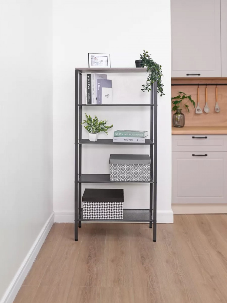 Простой в сборке аксессуар украсит любое помещение. Изделие изготовлено из высокопрочного металлического материала с полимерный покрытием, имеет прочный каркас и прослужит долгое время. Конструкция оснащена 5 полками для вашего комфорта и удобства, они фиксируются вертикальными перекладинами на углах. Открытый комнатный стеллаж на регулируемых ножках имеет надежные крепления. Сетчатые и ЛДСП полочки выдержат нагрузку до 8 кг.