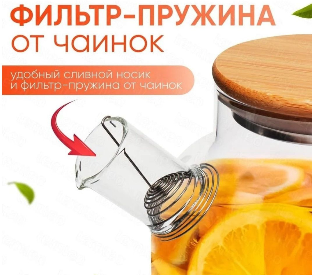 Универсальный чайник объемом 1000 мл оснащен удобным сливным носиком с фильтром ситечко. Ручка чайника не нагревается даже при кипячении. Крышка из натурального бамбука плотно прилегает к стеклу, не пропуская запахи. Фильтр-пружинка, встроенный в носик, собирает чаинки и кусочки фруктов.