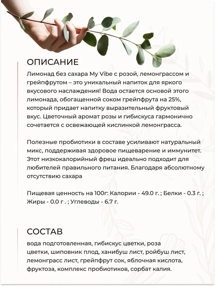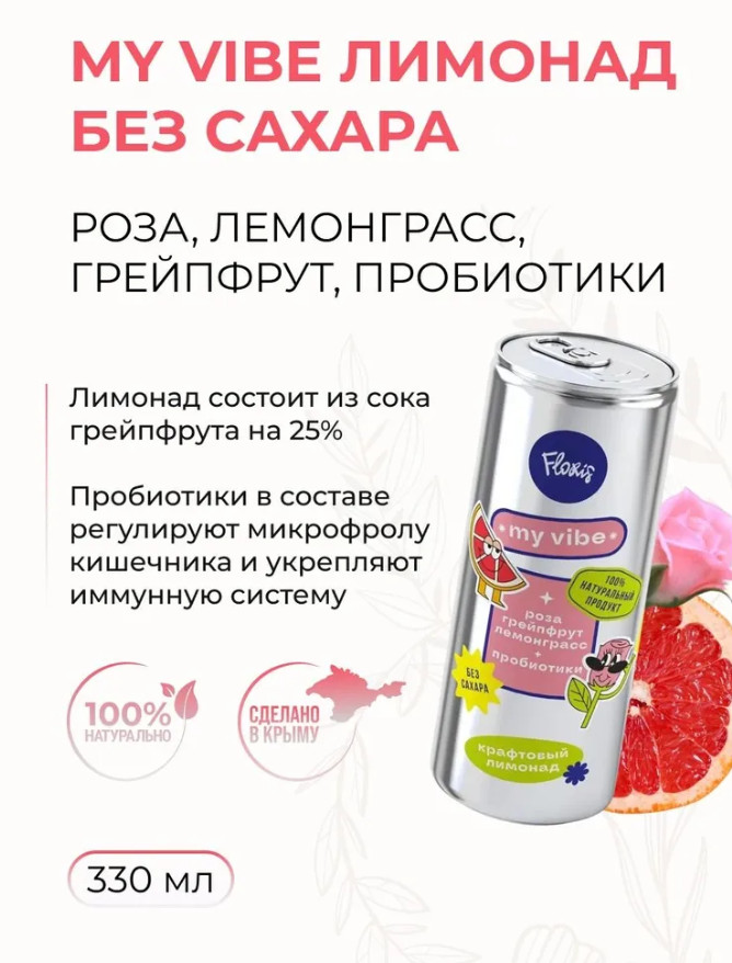 Лимонад без сахара My Vibe с розой, лемонграссом и грейпфрутом — это уникальный напиток для яркого вкусового наслаждения! Вода остается основой этого лимонада, обогащенной соком грейпфрута на 25%, который придает напитку выразительный фруктовый вкус.