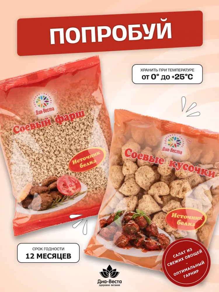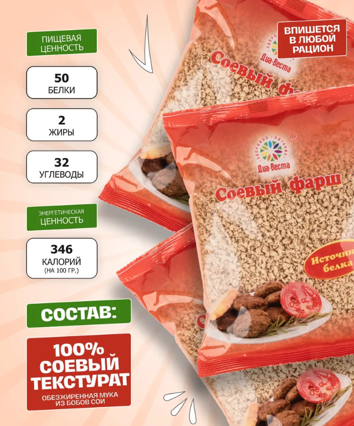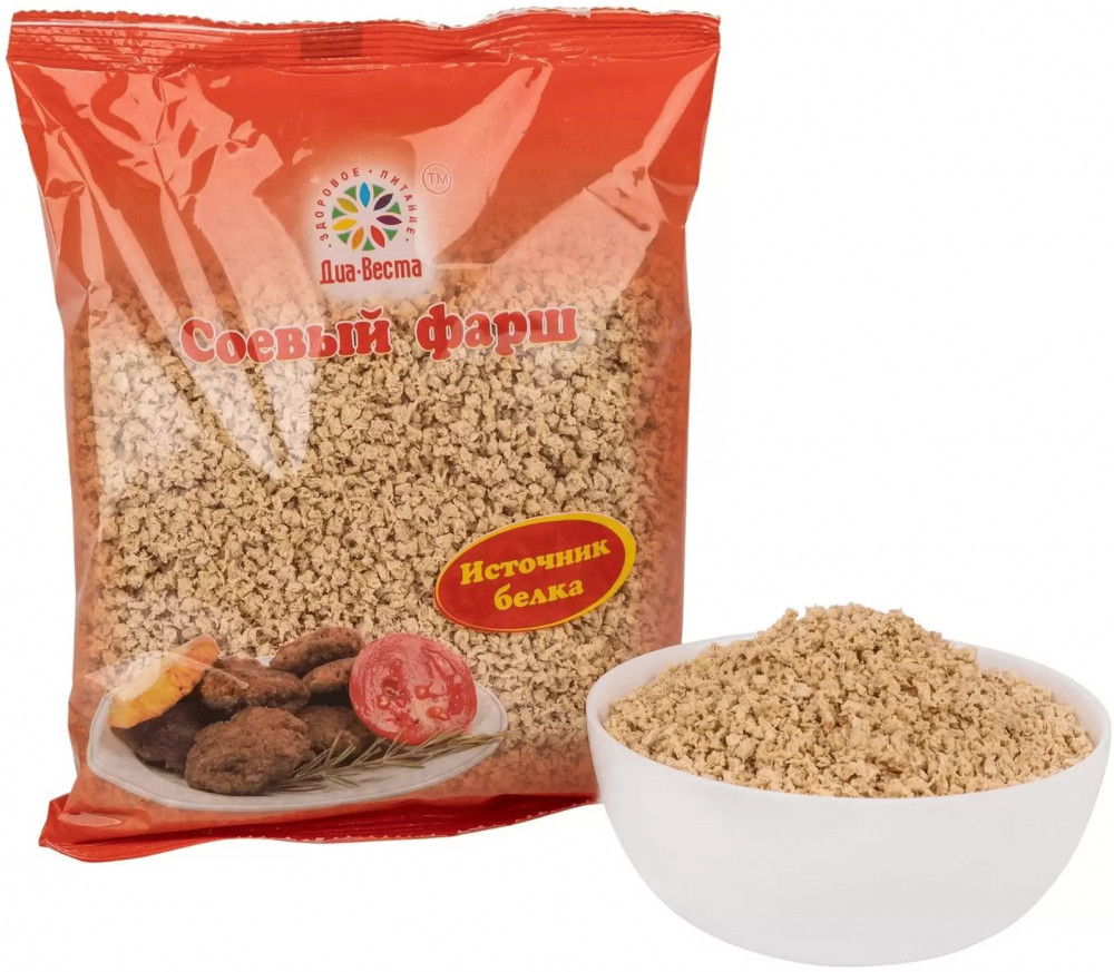 Соевый фарш — идеально заменит мясо. Идеально в пост! Подходит для диетического питания. Идеальная замена мяса в пост. Соевый фарш от производителя ПО Диа-Веста — продукция здорового и функционального питания для каждого. Постные полезные продукты богаты белком, растительными маслами и клетчаткой с превосходным вкусом растительного мяса. Растительный белок по своим качествам близок к белкам мяса, молока и яиц. Благодаря этому быстро устранит чувство голода и при этом не наградить вас лишними калориями. Растительный фарш самый универсальный vegan продукт для здорового пп питания и похудения. Произведен из бобов сои, выращенной в РФ.