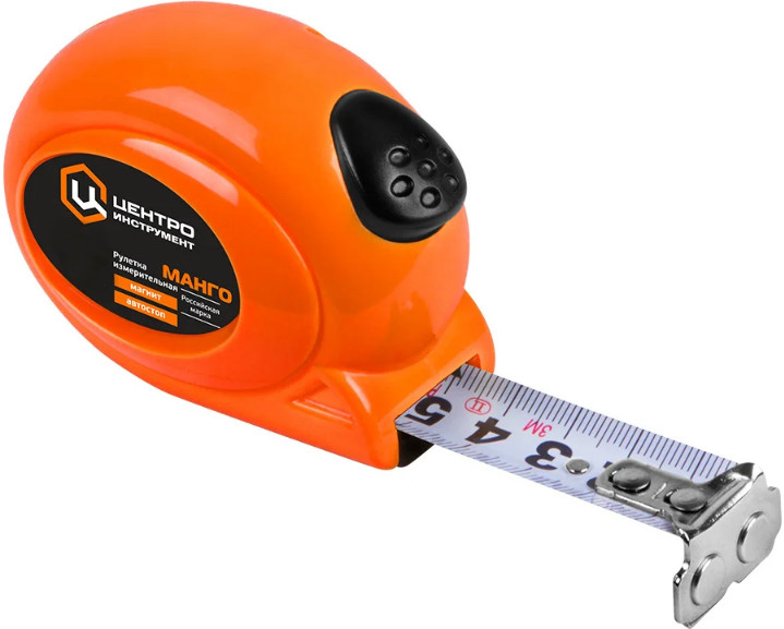 Рулетка Центроинструмент Манго 1307-8-25 выполнена из прочного пластика, устойчивого к ударам. Для удобства работы изделие оснащается прочной стальной лентой и мощным механизмом возврата. Комфортное прочтение данных с ленты обеспечивается большим размером цифр. В случае измерений внутренних размеров имеются магниты, расположенные в зацепе.