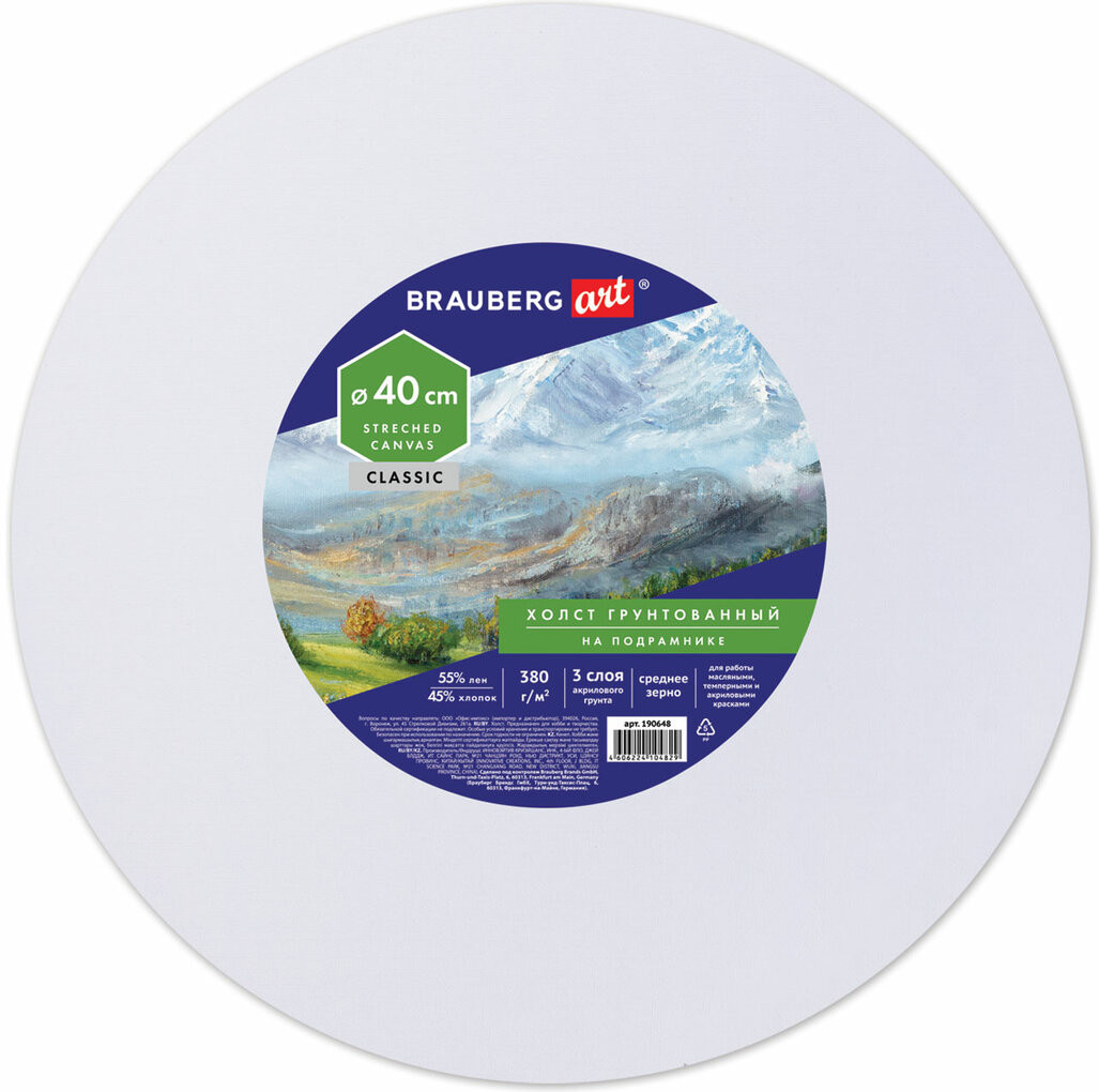 💳 Оплатить за товар можно при получении 🇰🇿 Есть бесплатная доставка по Казахстану от 1 дня 🎁 Копите бонусы с каждой покупки Серия: Art Classic Холст на подрамнике Brauberg Art «Classic» используется для работы масляными, темперными и акриловыми красками. Предназначен для учеников и студентов художественных школ, художников. Изготовлен из 45% хлопка и 55% льна, плотность — 380 г/м². Полотно из смеси хлопка и льна объединяет в себе положительные качества обоих материалов. Среднезернистая фактура обеспечивает холсту универсальность в использовании, позволяет писать в различных техниках. Односторонний трехслойный акриловый грунт позволяет сохранить цвета неизменными, не допуская их прожухания. Холст круглой формы на подрамнике полностью готов к работе. Диаметр — 40 см. Подрамник — 17×38 мм. Идеально натянутый грунтованный холст дает возможность безотлагательно приступить к созданию шедевра. Приобретайте холсты на подрамнике Brauberg Art «Classic» и воплощайте любые творческие идеи! |