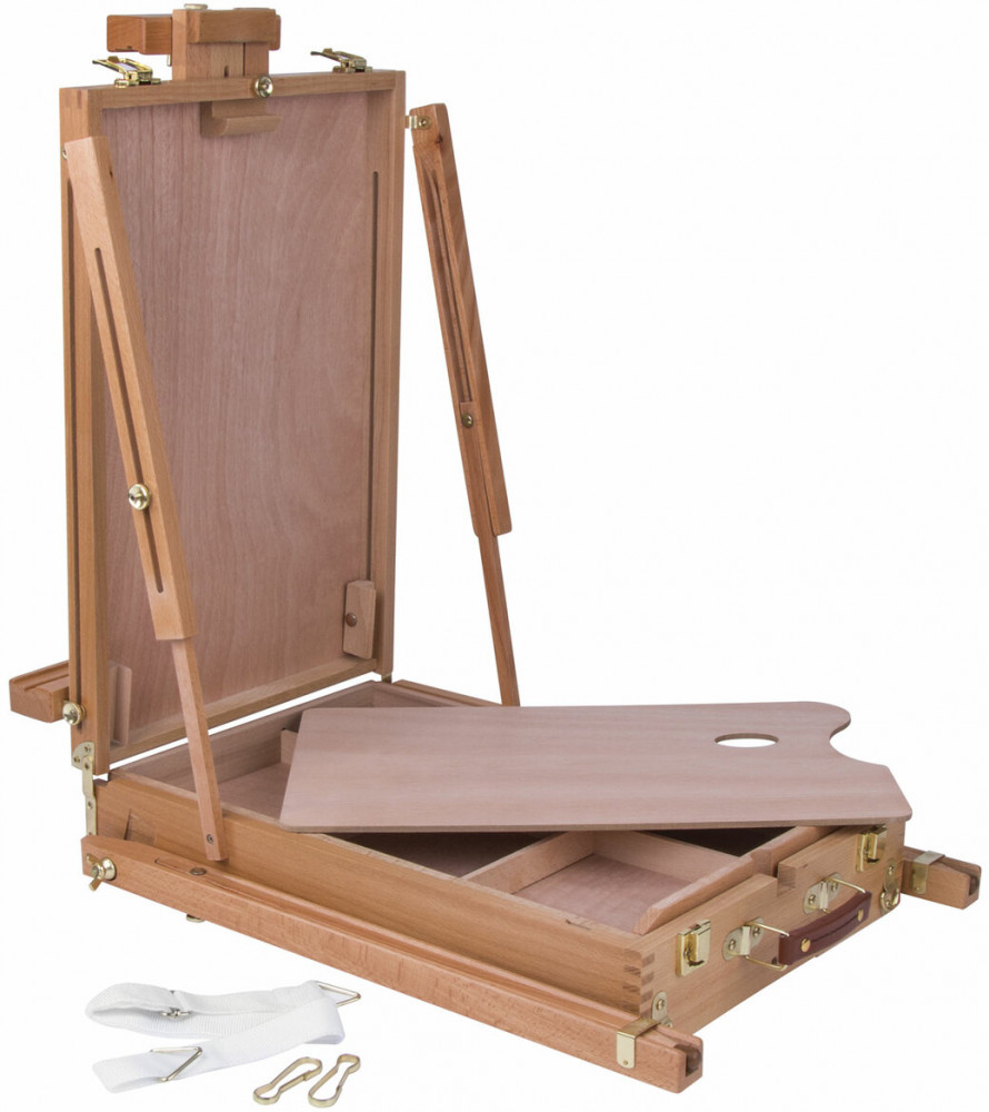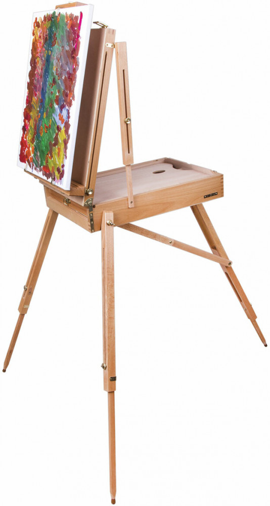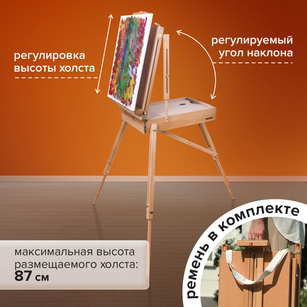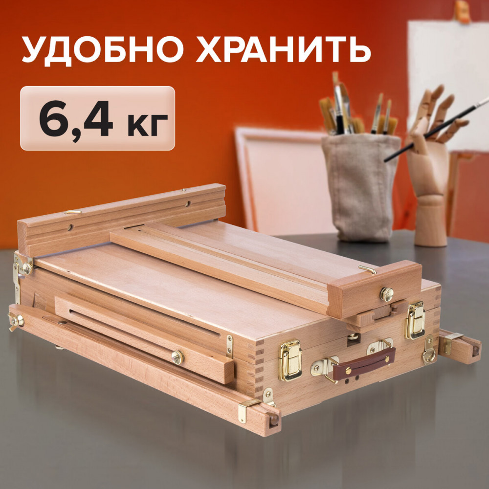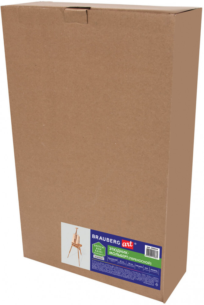 Этюдник Brauberg Art «Classic» предназначен для выполнения этюдов масляными красками или акварелью. Дает возможность работать на холсте и картоне в условиях мастерской и на пленэре. Будет полезен тем, кто осваивает живописные приемы. Изготовлен из натурального бука, пропитанного маслом, с применением качественной фурнитуры. Оснащен ящиком для хранения кистей и палитрой для красок. Этюдник позволяет комфортно работать как сидя, так и стоя, благодаря съемным телескопическим ножкам длиной 90 см и регулирующему наклону холста с его максимальной высотой — до 87 см. Для удобства переноски имеется регулируемый тесемный ремень. Размер в сложенном виде — 50×34×11 см. Размер в разложенном виде — 86×110×180 см. Вес — 6.4 кг.