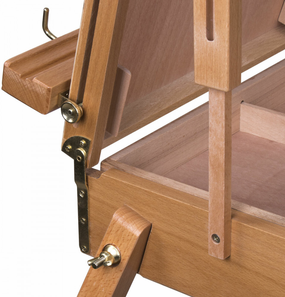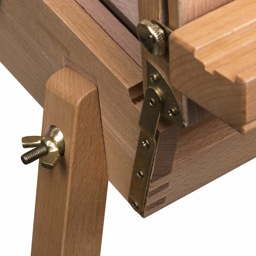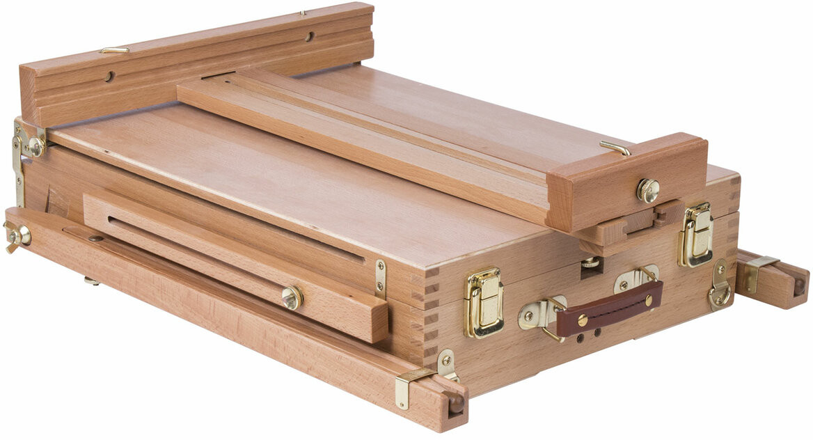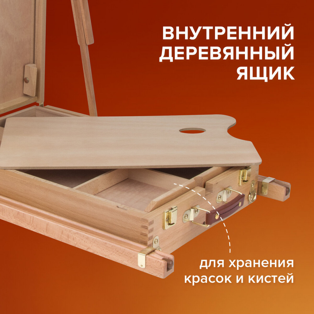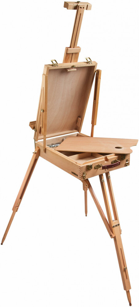 Этюдник Brauberg Art «Classic» предназначен для выполнения этюдов масляными красками или акварелью. Дает возможность работать на холсте и картоне в условиях мастерской и на пленэре. Будет полезен тем, кто осваивает живописные приемы. Изготовлен из натурального бука, пропитанного маслом, с применением качественной фурнитуры. Оснащен ящиком для хранения кистей и палитрой для красок. Этюдник позволяет комфортно работать как сидя, так и стоя, благодаря съемным телескопическим ножкам длиной 90 см и регулирующему наклону холста с его максимальной высотой — до 87 см. Для удобства переноски имеется регулируемый тесемный ремень. Размер в сложенном виде — 50×34×11 см. Размер в разложенном виде — 86×110×180 см. Вес — 6.4 кг.