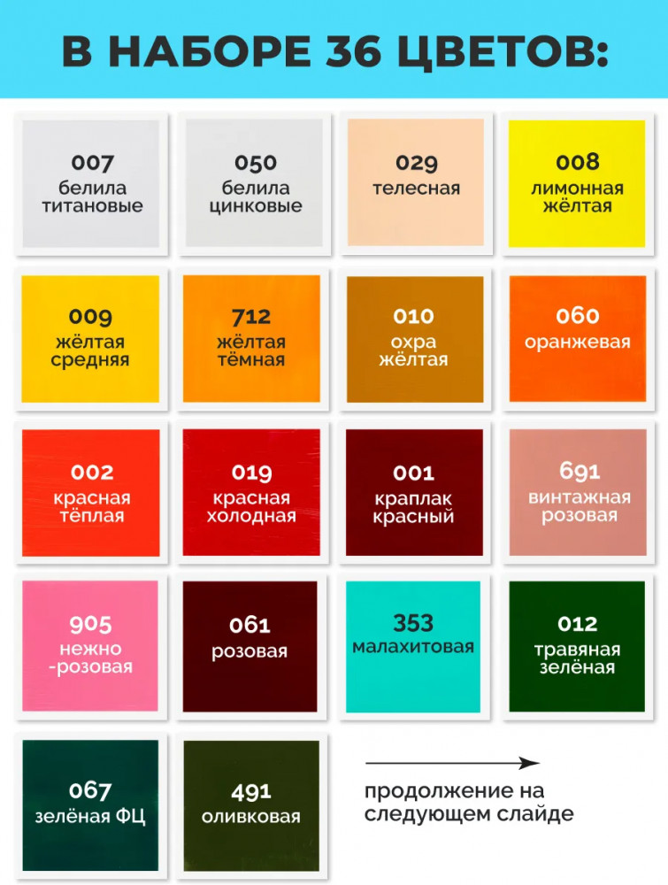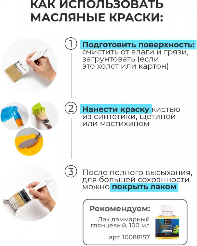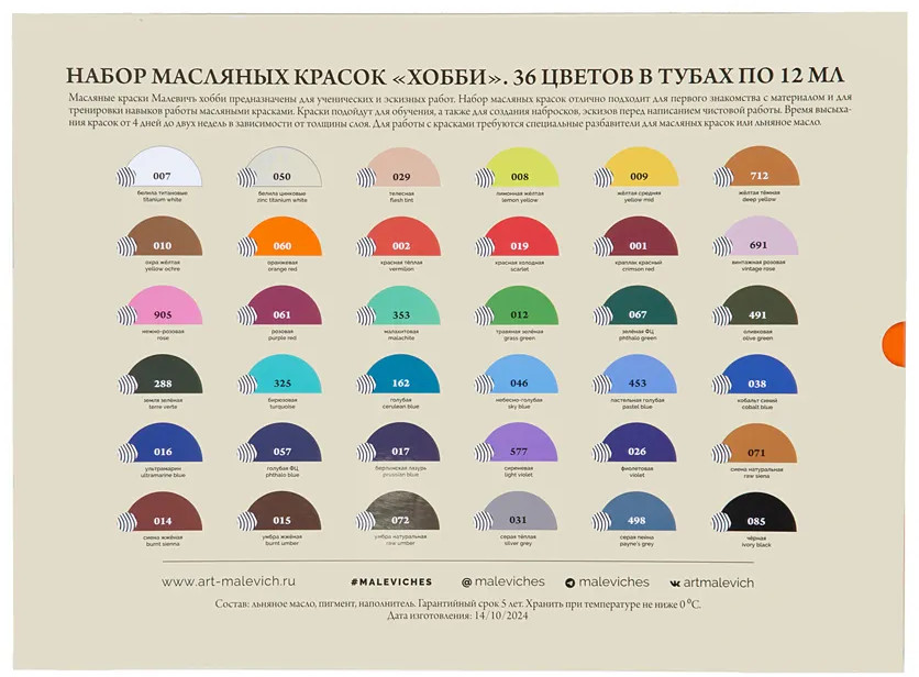💳 Оплатить за товар можно при получении 🇰🇿 Есть бесплатная доставка по Казахстану от 1 дня 🎁 Копите бонусы с каждой покупки Профессиональные масляные краски Малевич изготавливаются из высококачественных, светостойких пигментов и натурального, очищенного льняного масла. Отлично ложатся на холст, имеют яркие, насыщенные цвета, которые удовлетворят как сторонников классической живописи, так и любителей авангарда. В производстве используются только экологически чистые и безопасные материалы. Отсутствие материалов животного происхождения, в том числе пигментов, делает краски подходящими для веганов. Содержание пигмента и масла сбалансировано таким образом, чтобы получить идеальную мягкую консистенцию, позволяющую писать даже неразбавленными красками. Тончайший перетир пигмента дает возможность идеально смешивать цвета красок, а также работать методом |