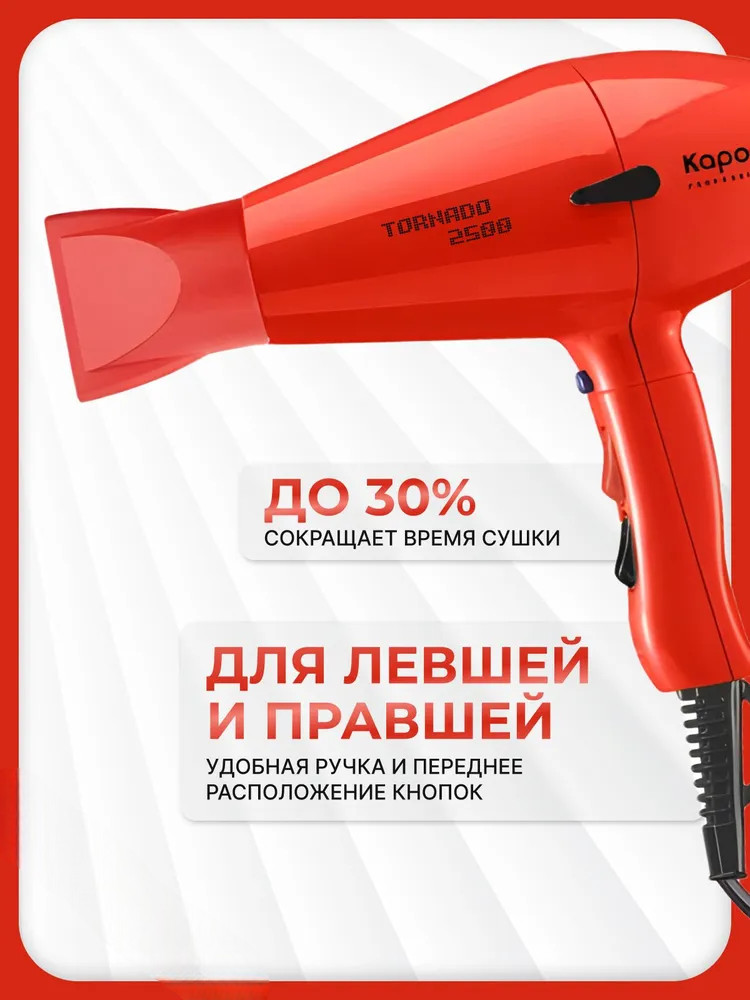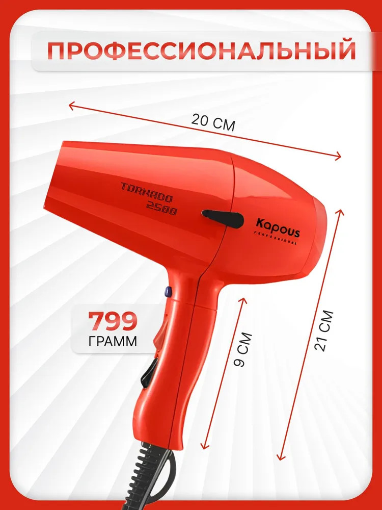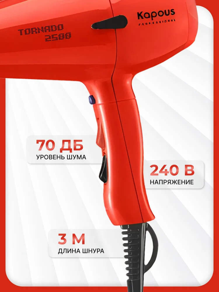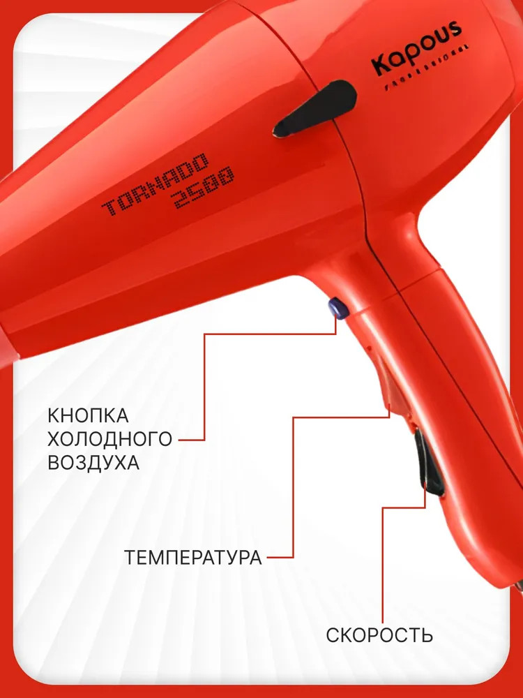 Профессиональный фен для волос с повышенной мощностью модель Tornado-2500 Kapous Professional. Идеально подходит для длительных и сложных укладок волос! Благодаря своей мощности и распределению воздушного потока, позволяет сократить время сушки до 30%. Эргономичная ручка и переднее расположение кнопок для регулировки позволяет работать как левой, так и правой рукой. Вес, мощность и малошумность фена обеспечивает комфортное выполнение укладок волос.