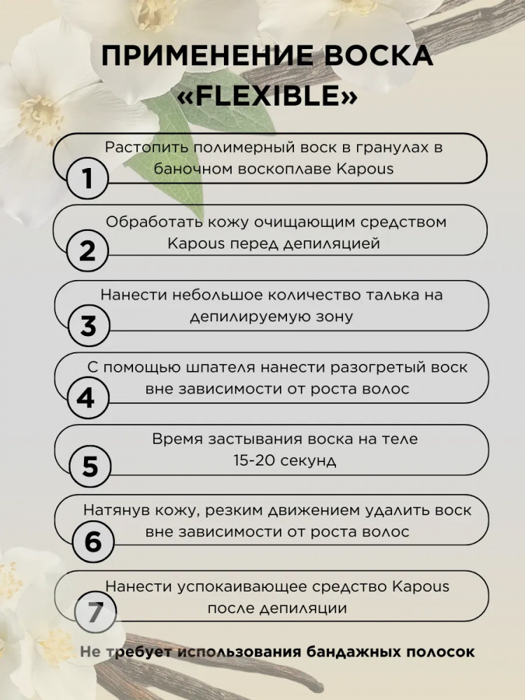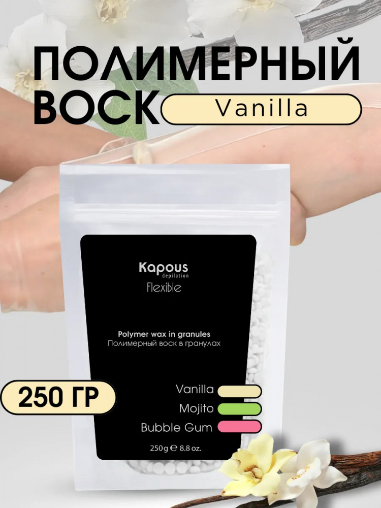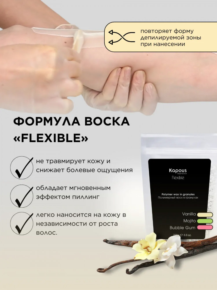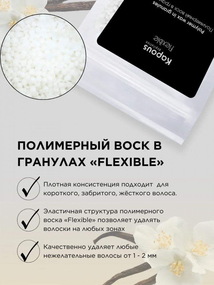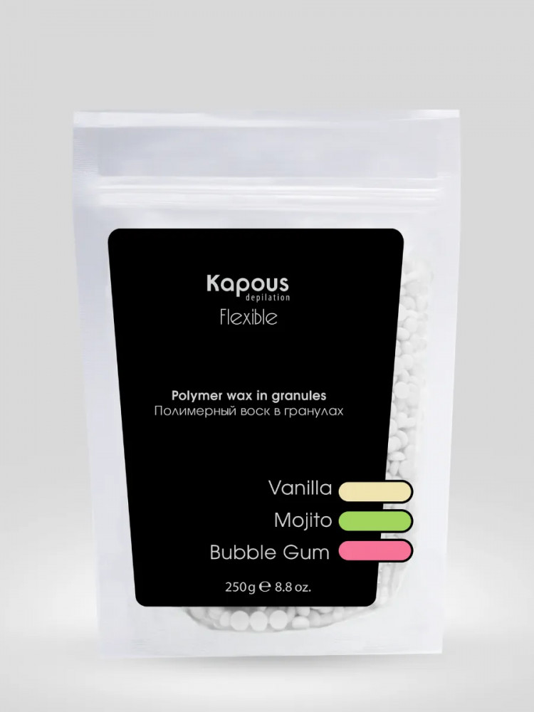 Полимерный воск в гранулах «Flexible» на синтетической основе Kapous. Новейшая формула для депиляции всего тела, лица, чувствительных участков кожи и интимных зон. Эластичная структура полимерного воска «Flexible» и низкая рабочая температура позволяют быстро и качественно удалять любые нежелательные волосы от 1 — 2 мм. Благодаря входящим в состав полимерам и маслам воск повторяет форму депилируемой зоны при нанесении, не травмирует кожу, снижает болевые ощущения, обладает мгновенным эффектом пиллинга. Нежная текстура воска легко наносится на кожу в независимости от роста волос. Профессиональный полимерный воск в гранулах «Flexible» лёгкой текстуры для депиляции любых зон, для всех типов кожи, для тонкого, светлого, пушкового волоса.