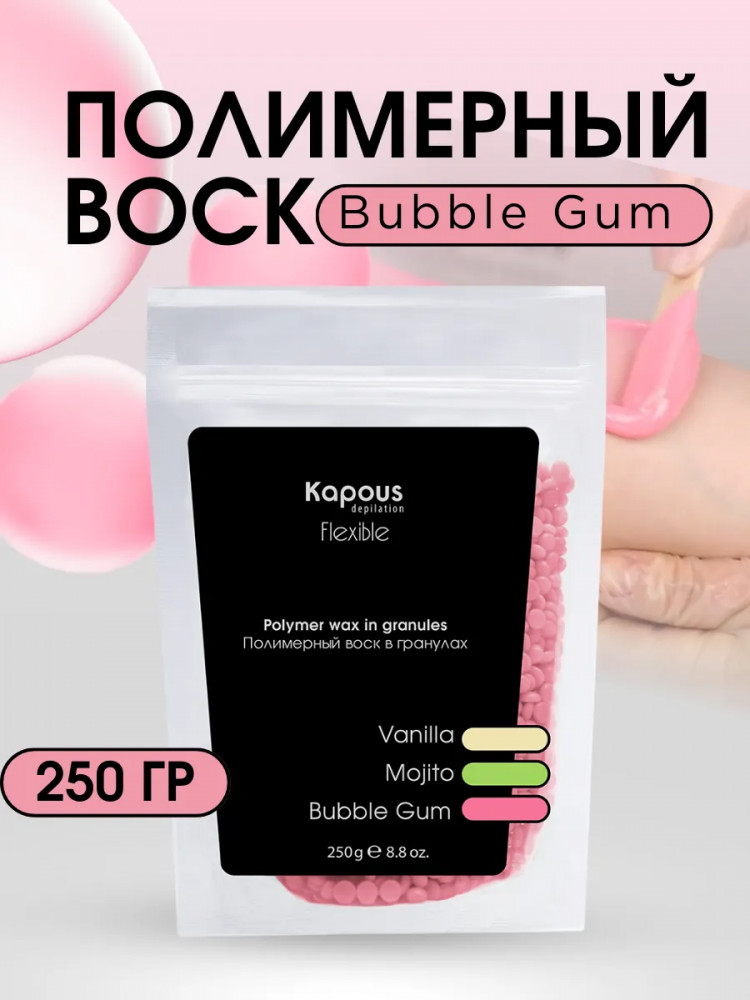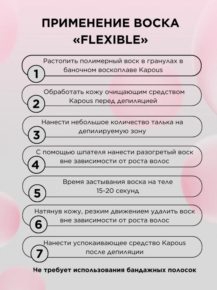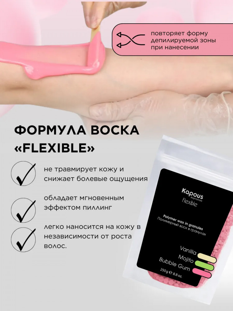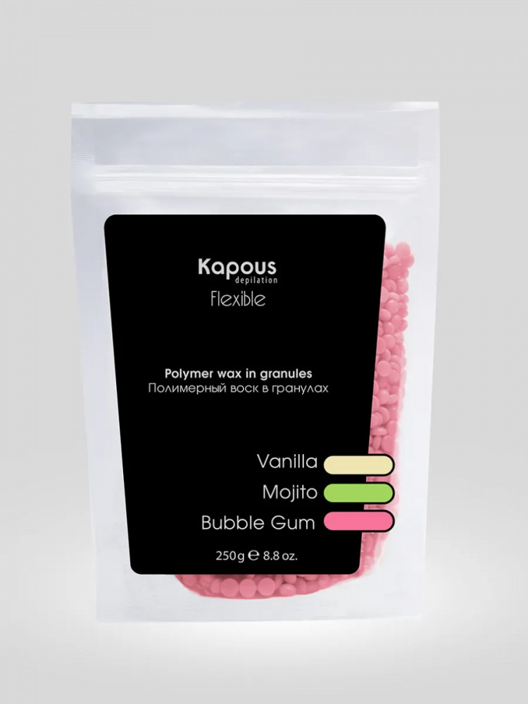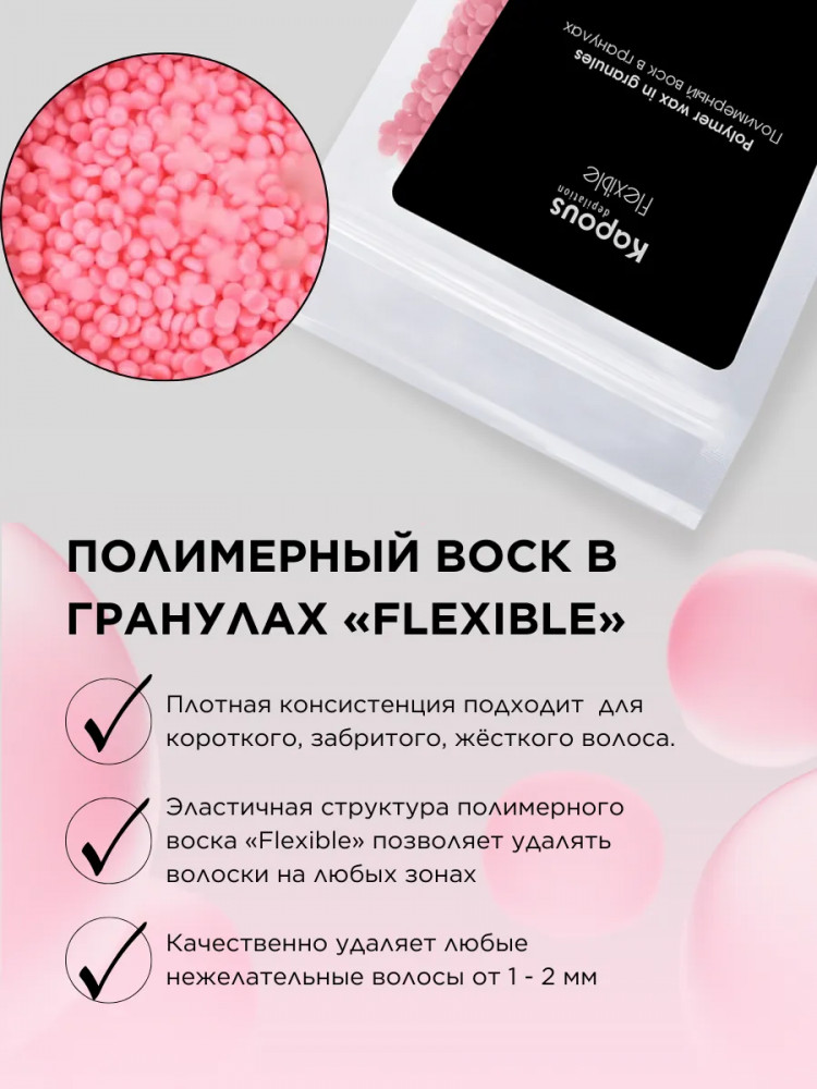 Полимерный воск в гранулах «Flexible» на синтетической основе Kapous. Новейшая формула для депиляции всего тела, лица, чувствительных участков кожи и интимных зон. Эластичная структура полимерного воска «Flexible» и низкая рабочая температура позволяют быстро и качественно удалять любые нежелательные волосы от 1 — 2 мм. Благодаря входящим в состав полимерам и маслам воск повторяет форму депилируемой зоны при нанесении, не травмирует кожу, снижает болевые ощущения, обладает мгновенным эффектом пиллинга. Нежная текстура воска легко наносится на кожу в независимости от роста волос. Профессиональный полимерный воск в гранулах «Flexible» лёгкой текстуры для депиляции любых зон, для всех типов кожи, для тонкого, светлого, пушкового волоса.